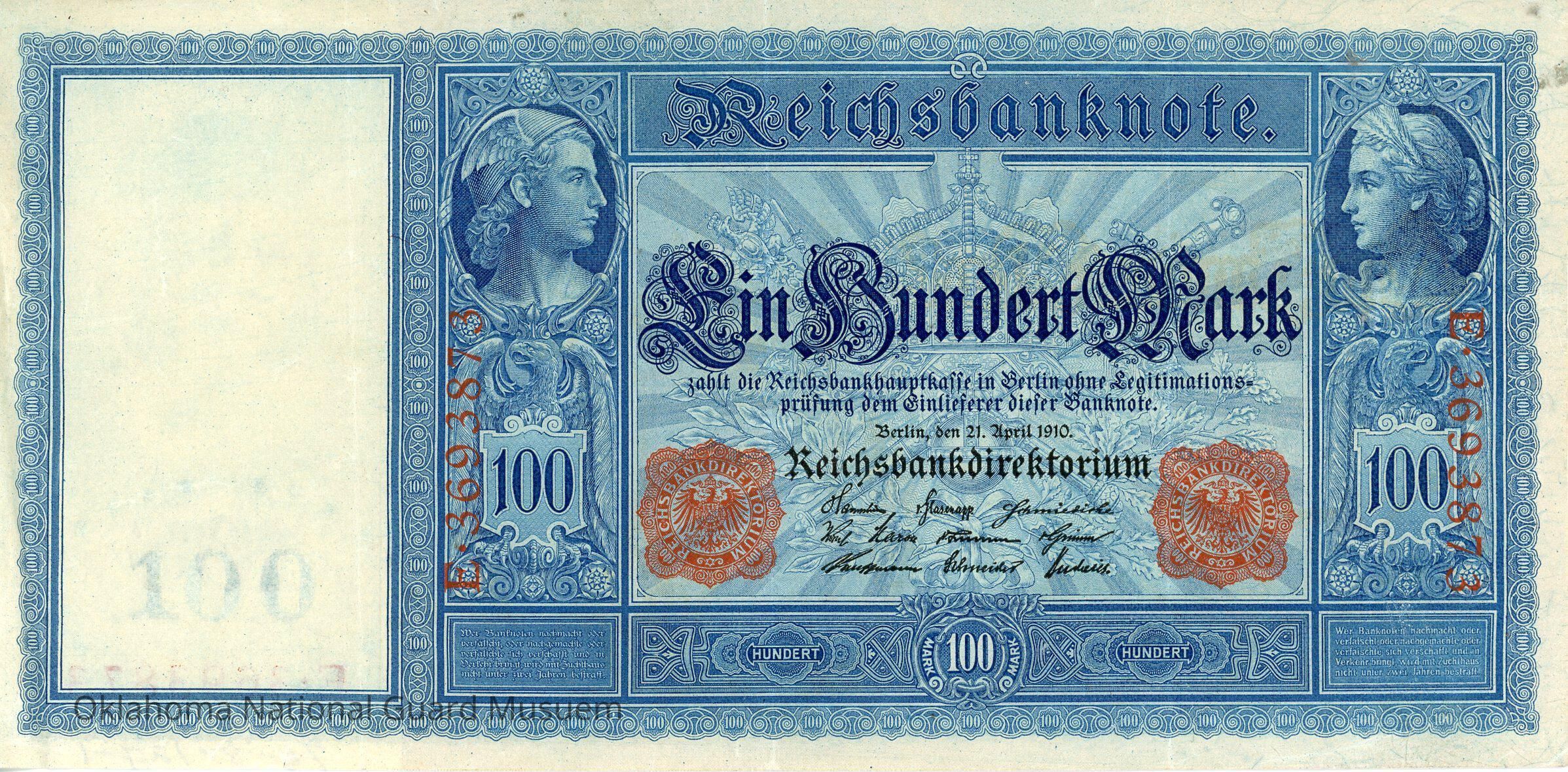Head in profile of Mercury on the left and head in profile of Minerva on the right in medallions. Crowned golden eagle. Imperial crown and insignia resting on oak leaves. Vertical prefix and numbering in red. Two seals of the Reichsbank in red. Texts in German. Signatures of the chairman and members of the boardTranscription