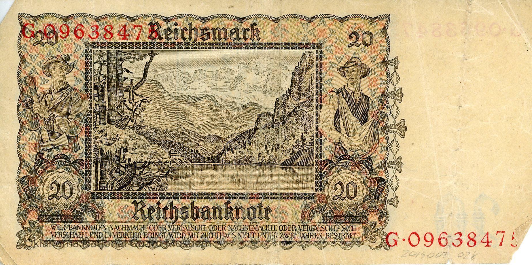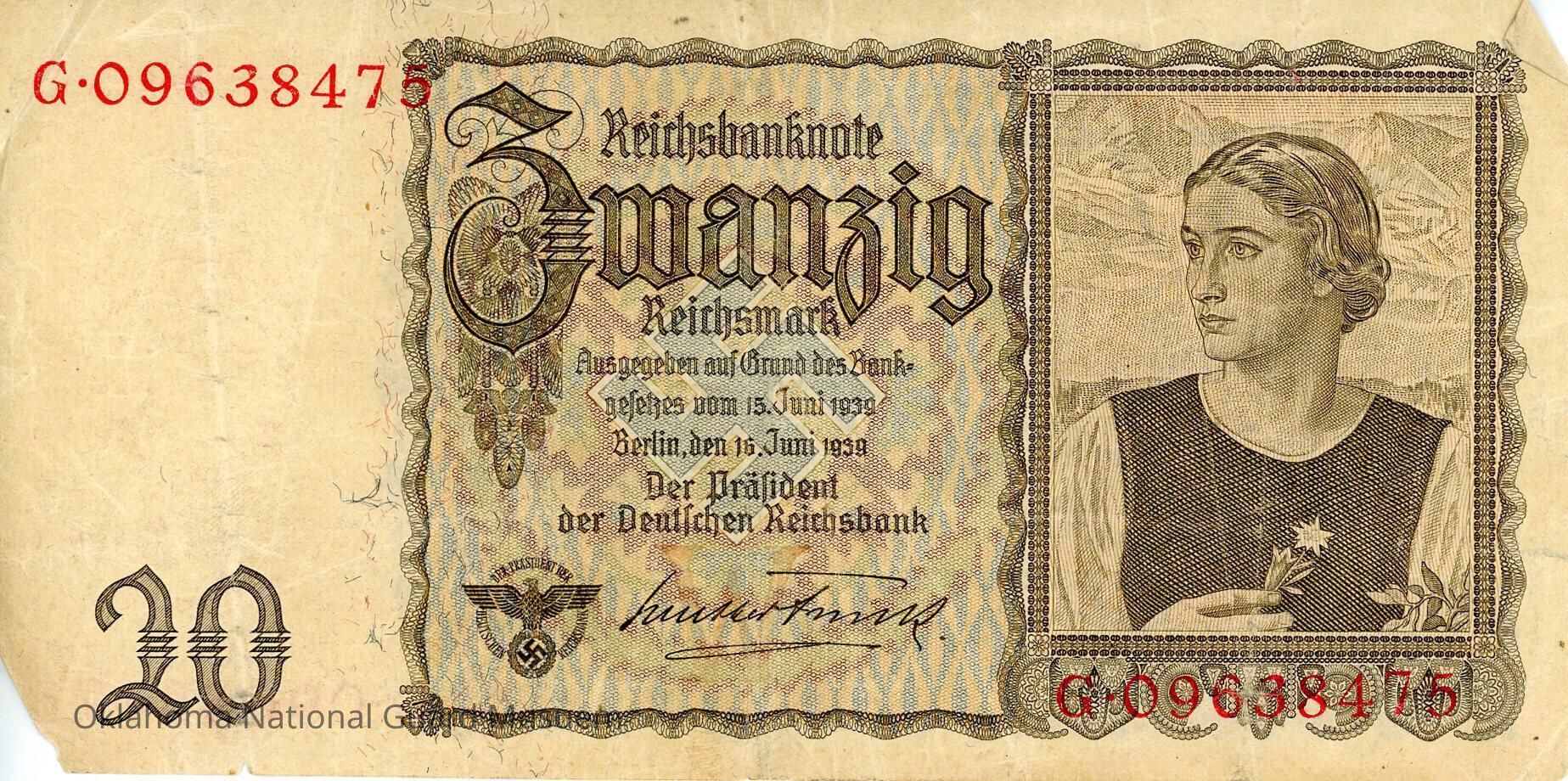 German Reichsbanknote Twenty Reichsmark. Accession number written on reverse at bottom. Dated June 16, 1939.
