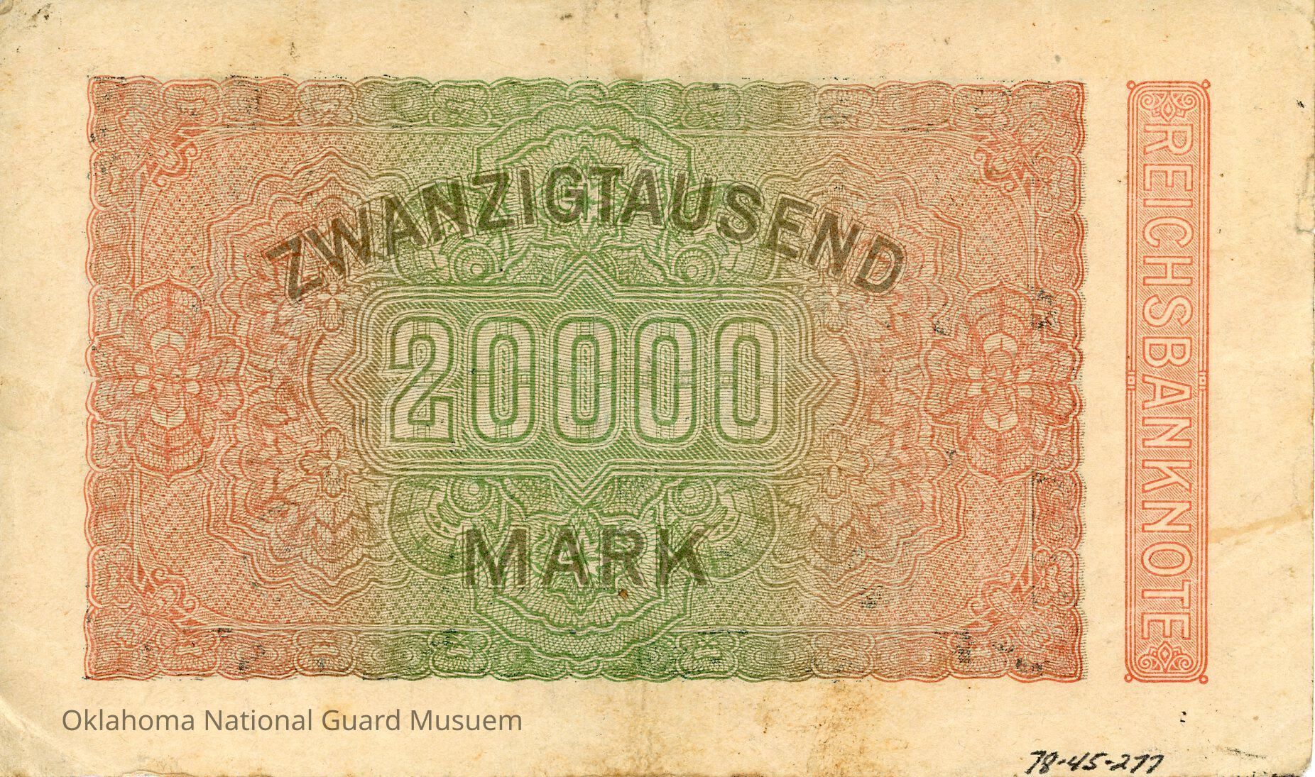 Texts in German. Numbering in black. Frame and background composed of guilloche shapes. Two seals of the Reichsbank in dark blue.Transcription
