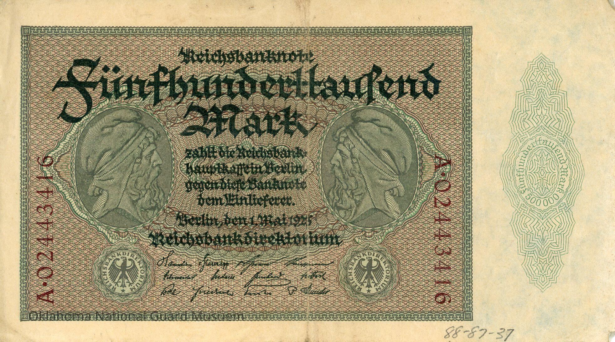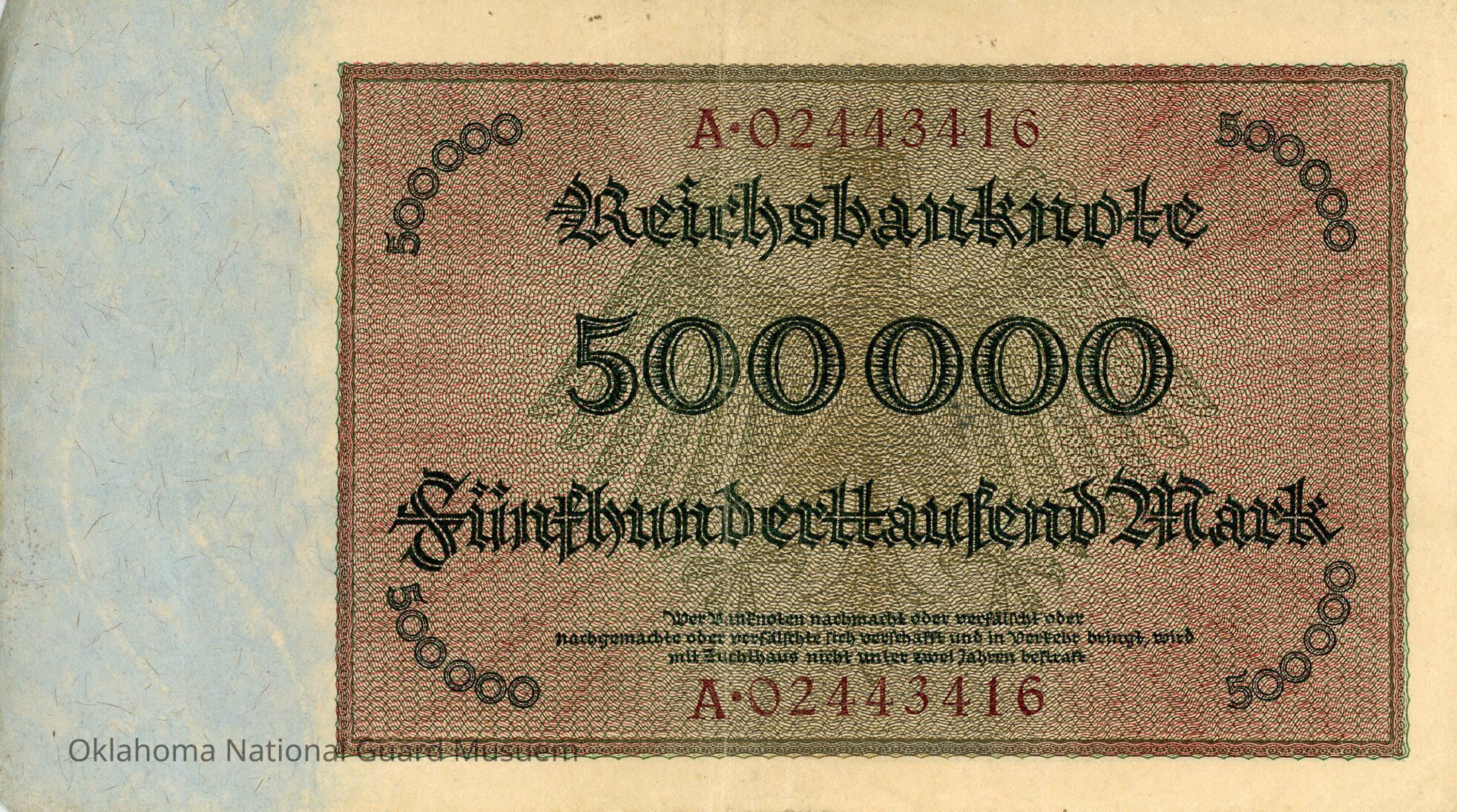 The Reichsbank Main Branch in Berlin will pay the holder of this note five Hundred Thousand Marks.
