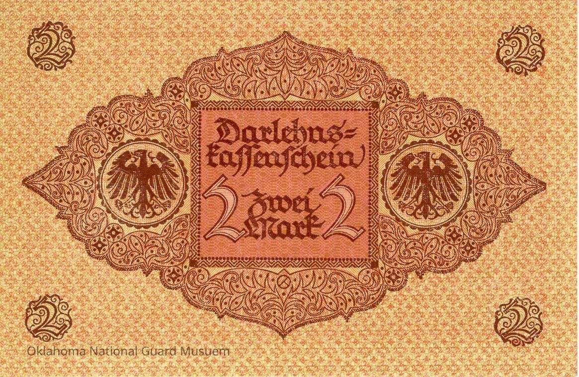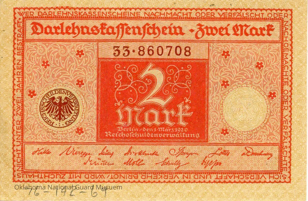 German Two Mark Type 1920. State loan note. Dated March 1, 1920. Accession number is written on obverse at bottom.Context
