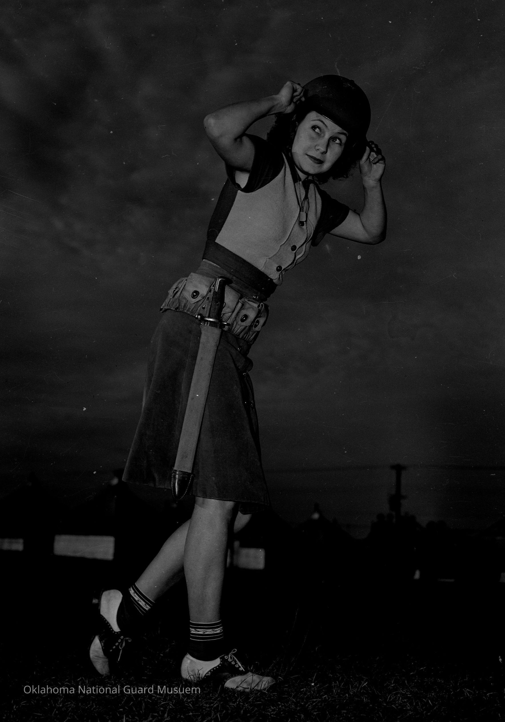 Negative of a girl wearing a helmet and pistol belt with bayonet