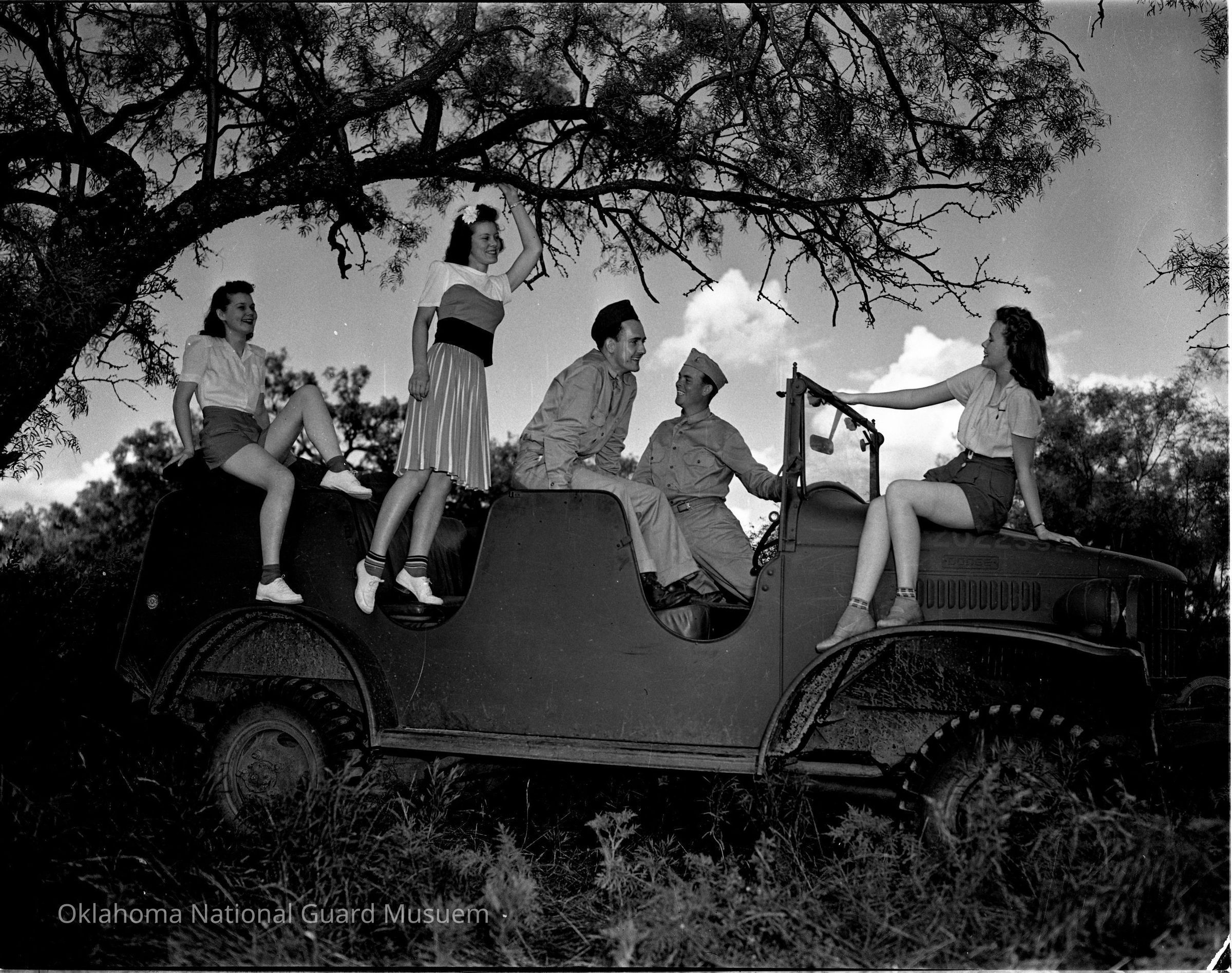 Girls and soldiers sitting on a command car