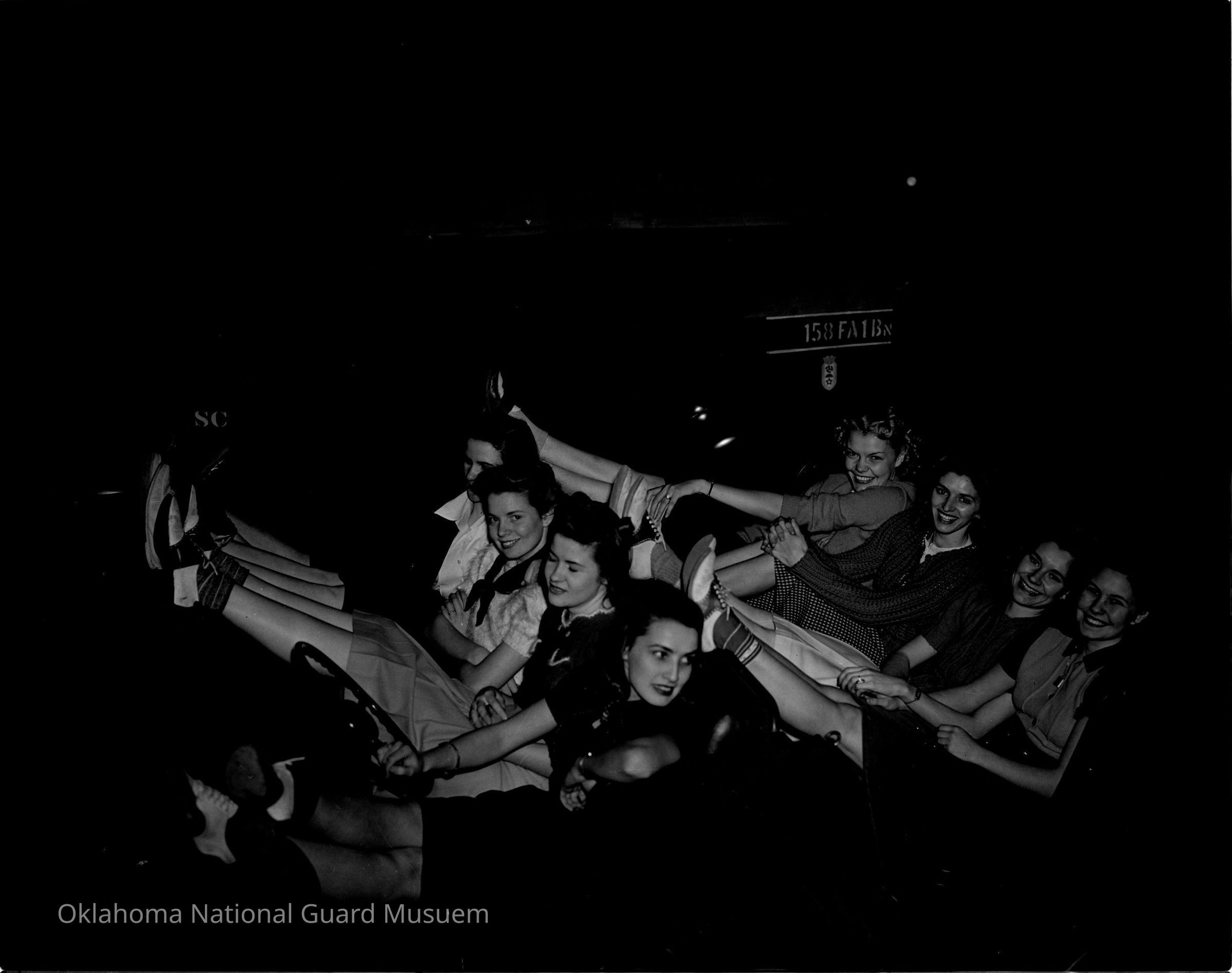 Negative of girls sitting in a command car. 158th Field Artillery