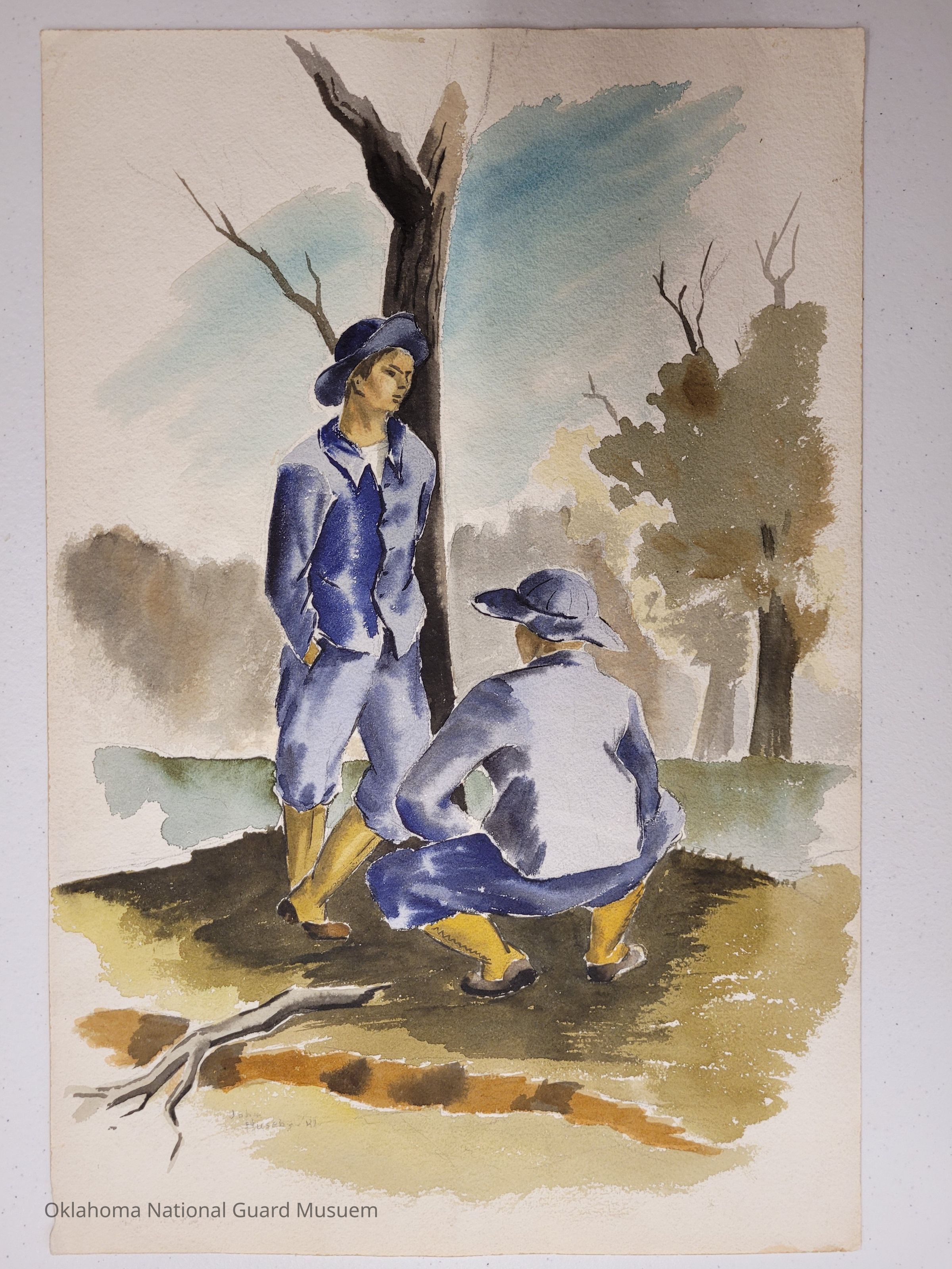 Soldiers in denim work uniforms resting by a tree