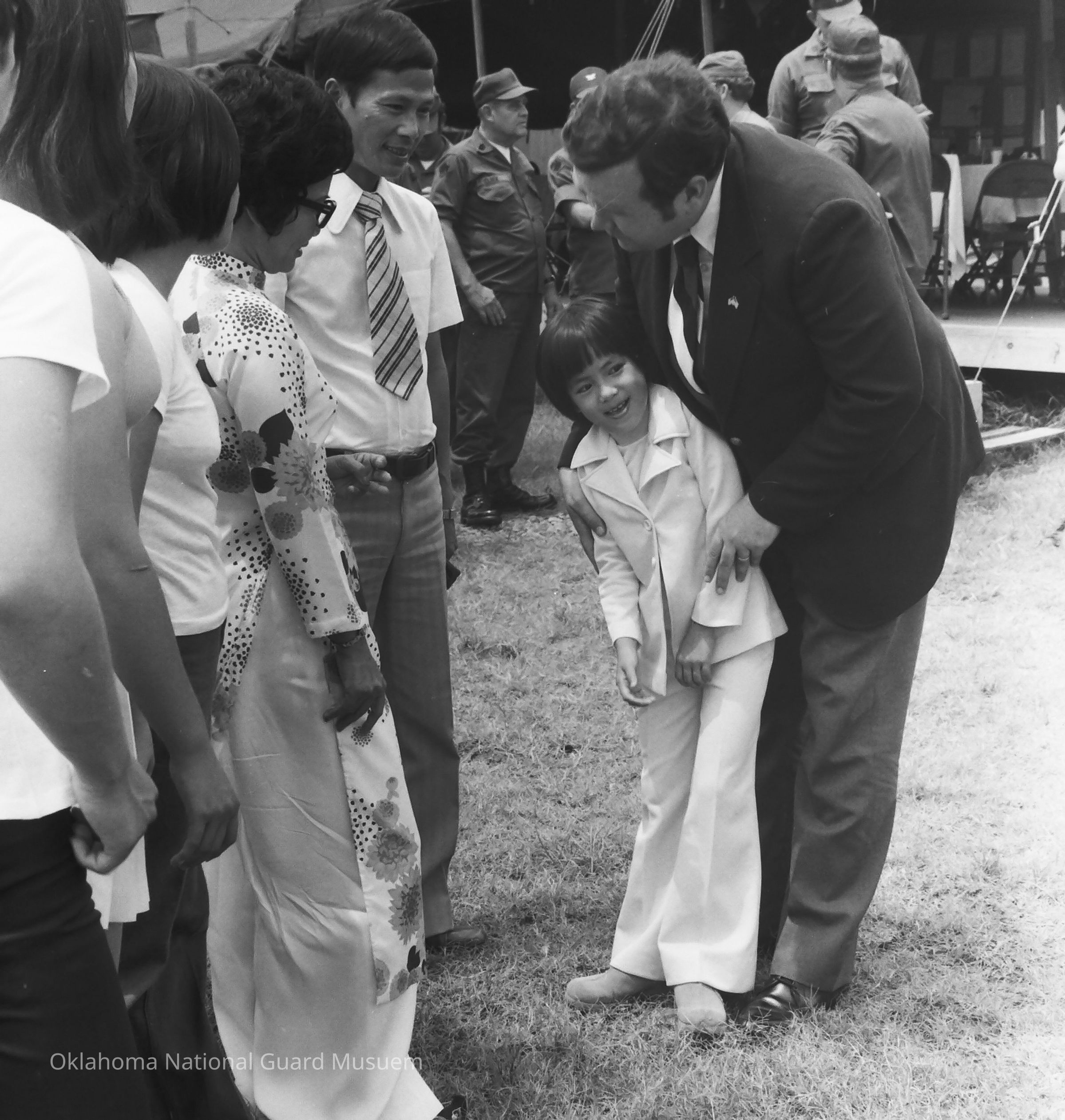 Negative of Govenor David Boren meeting a refugee family from Vietnam