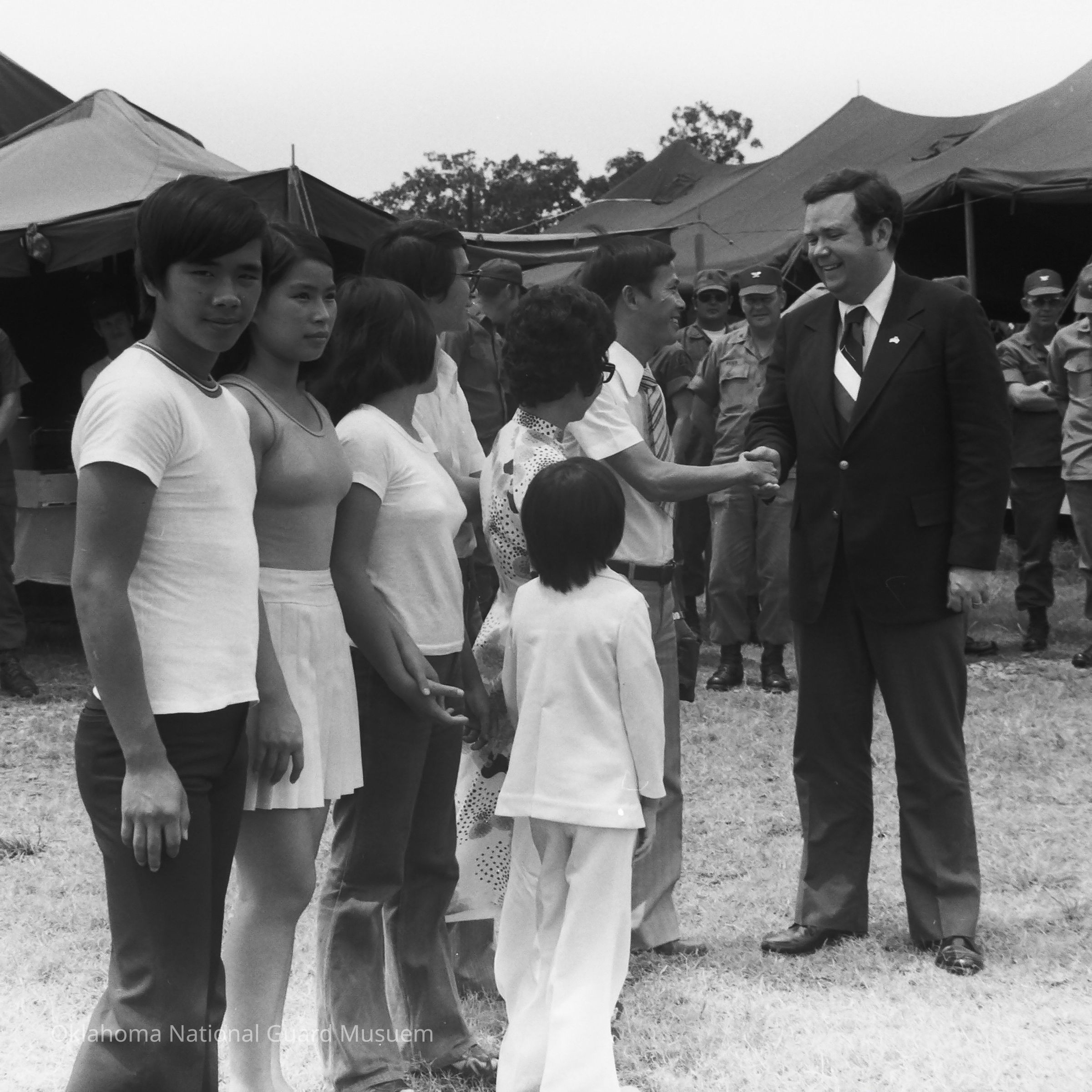 Negative of Govenor David Boren meeting a refugee family from Vietnam