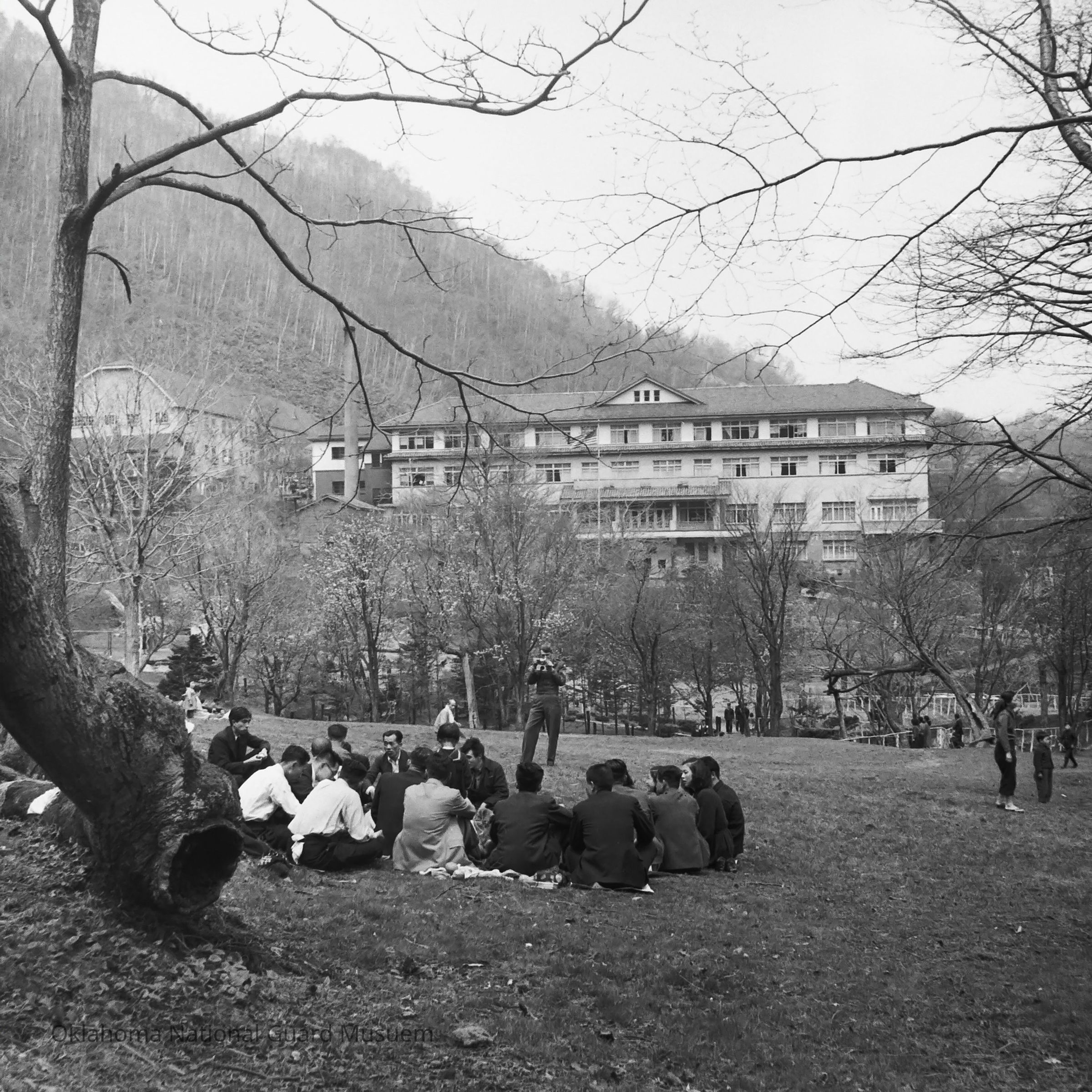 Group of Japanese civilians with the Noboribetsu Hotel in the background