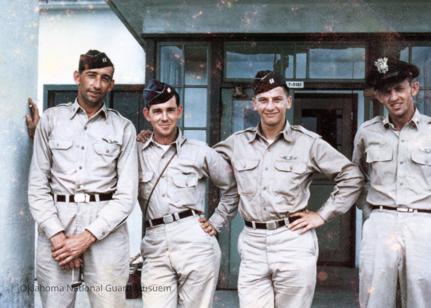 (Left to Right) Pilots Doyle Hastie, unknown, Stan Newman, and James Isbell during training. 185th Fighter Squadron