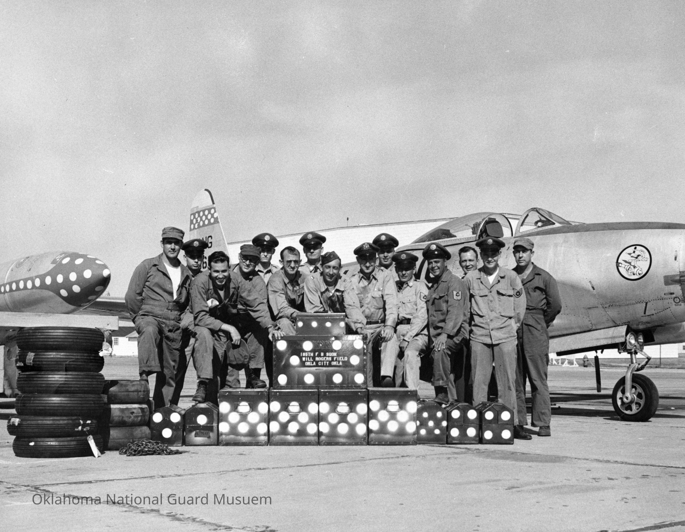 Group of pilots and airmen posing on painted polka dot boxes. Doyle Hastie in center. F-80 in background. 185th Fighter Bomber Squadron