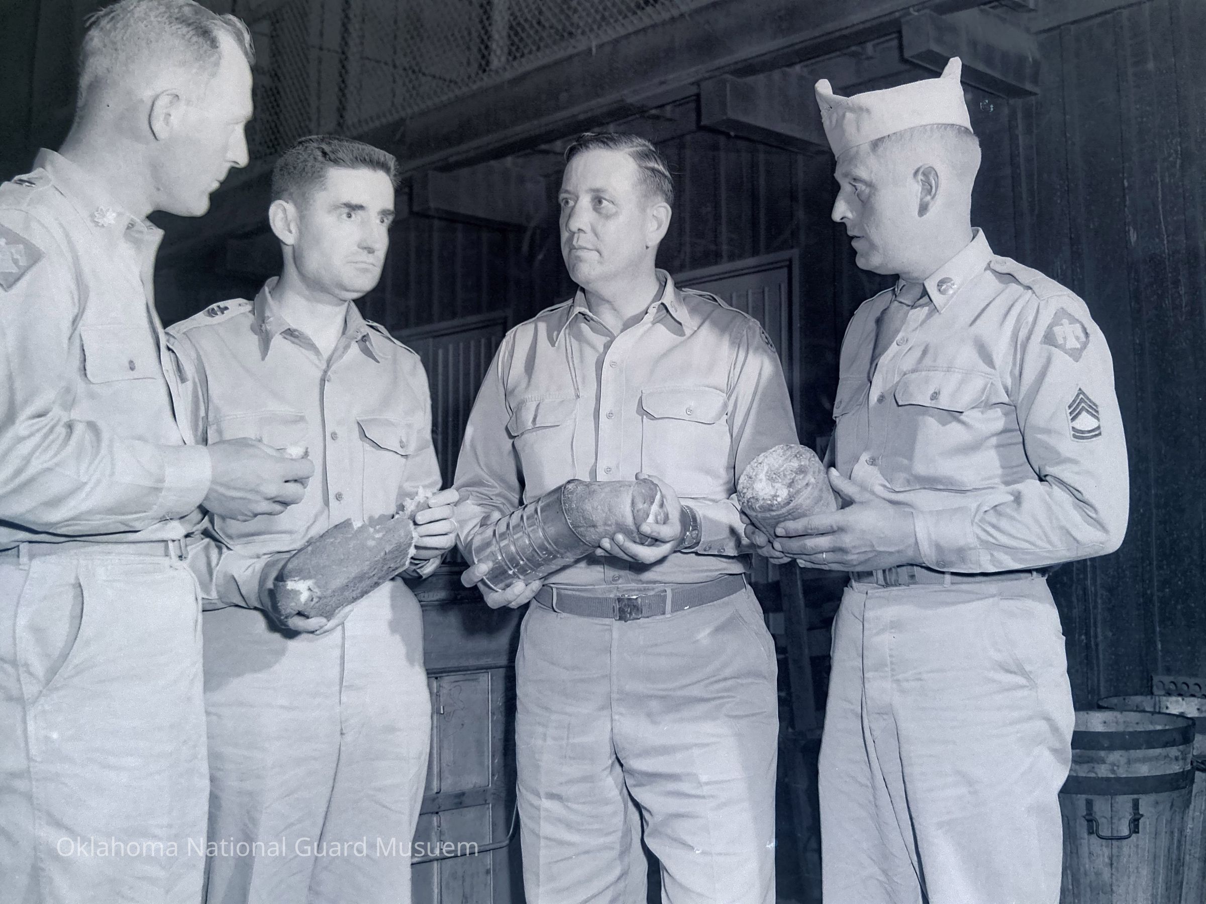 Negative of a group of soldiers and officers sampling bread on Hokkaido, Japan. Thurman Bruce, 120th Quartermaster, second from left