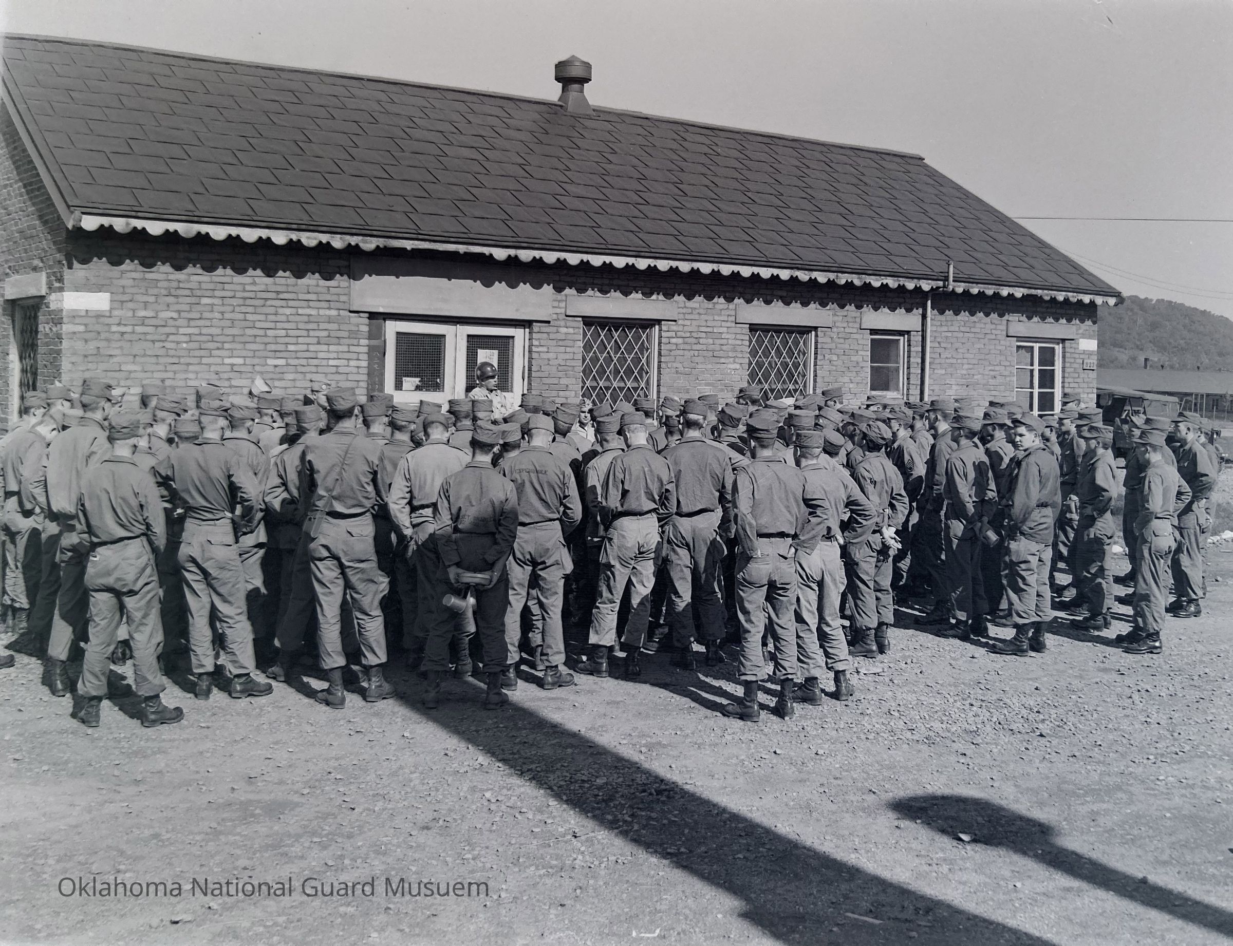 Group of soldiers assembled around a camp building entrance
