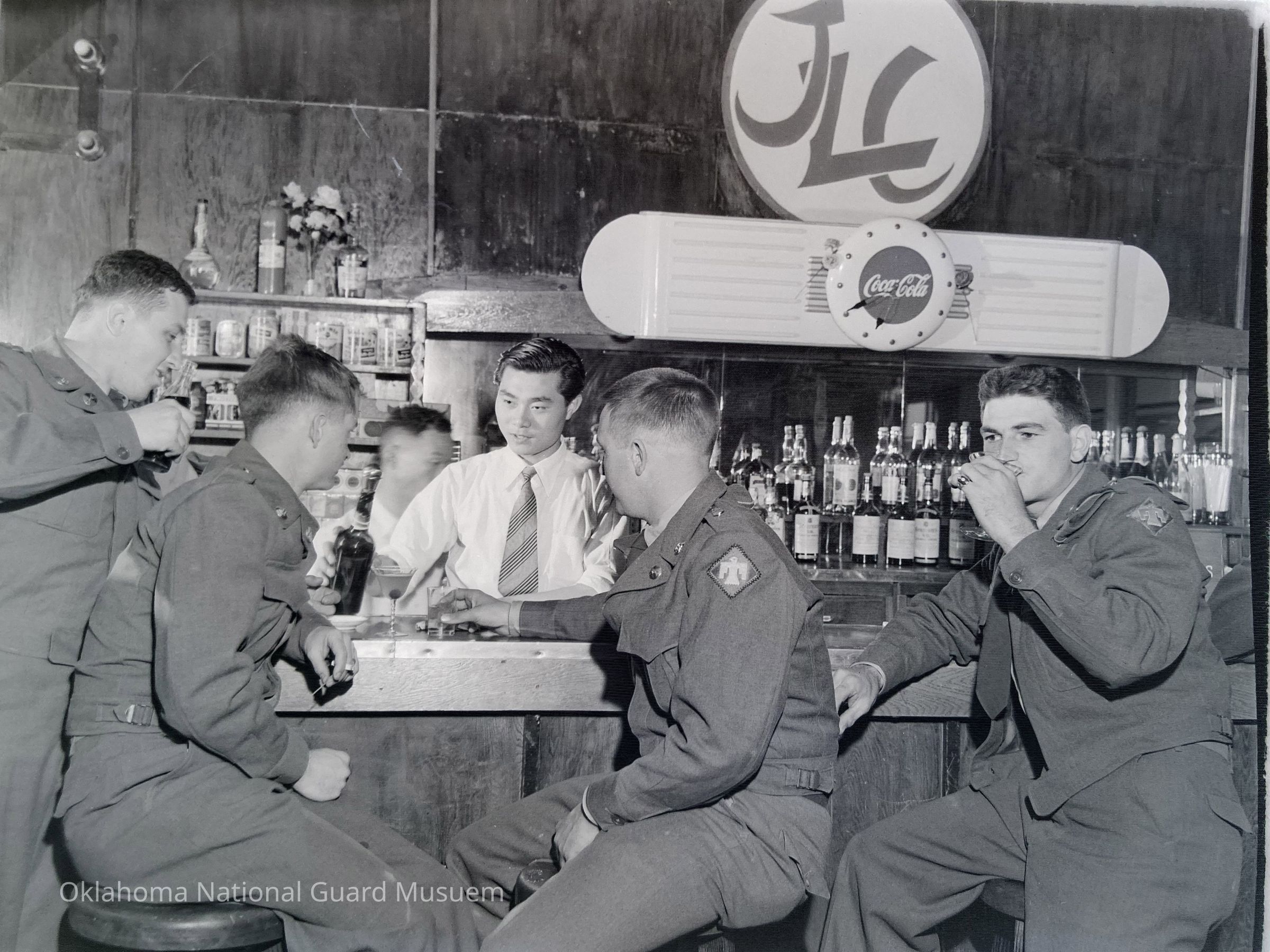 Negative of a group of soldiers drinking at a bar on Hokkaido, Japan