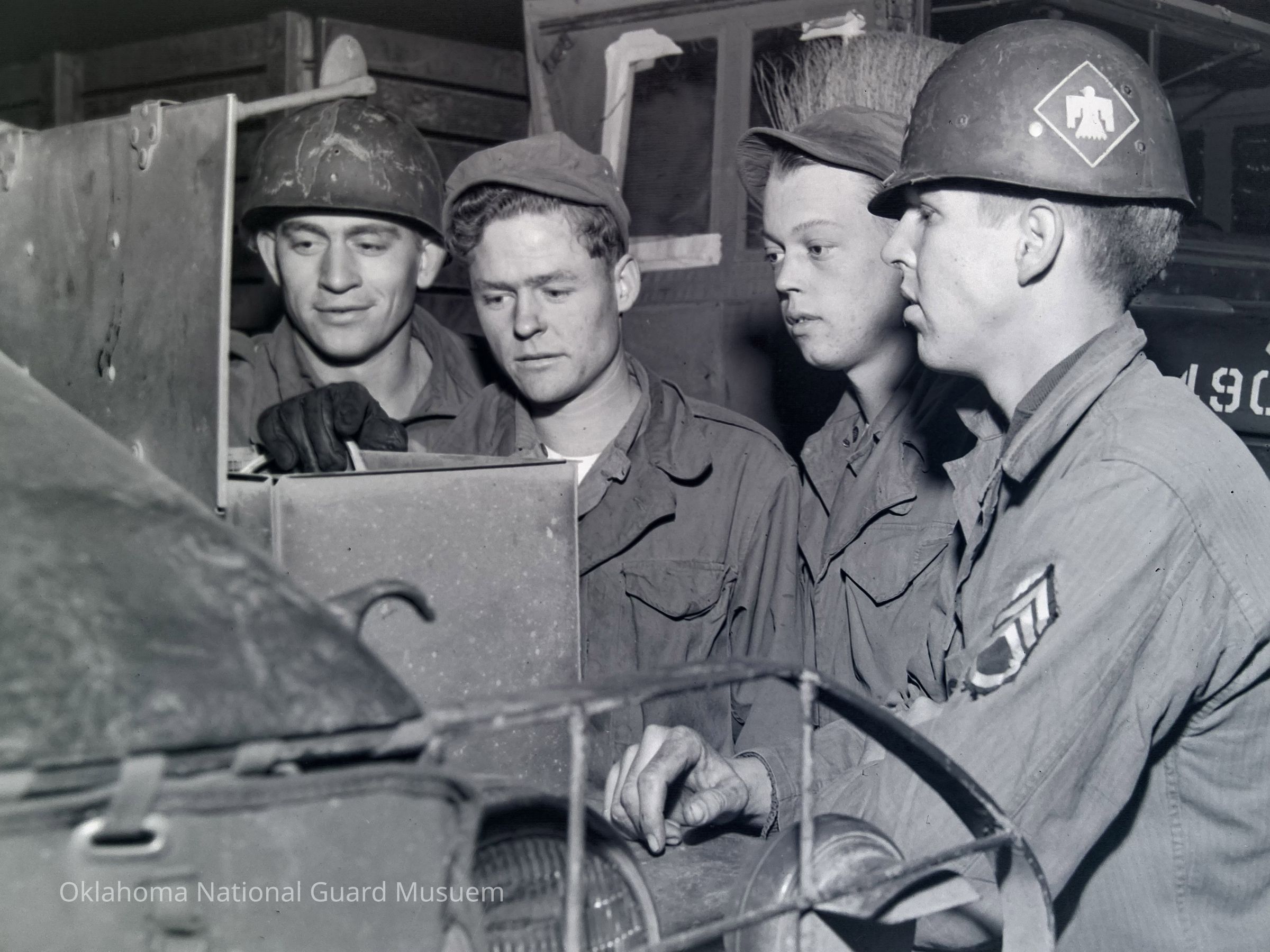 Group of soldiers examining a box on the fender of a truck