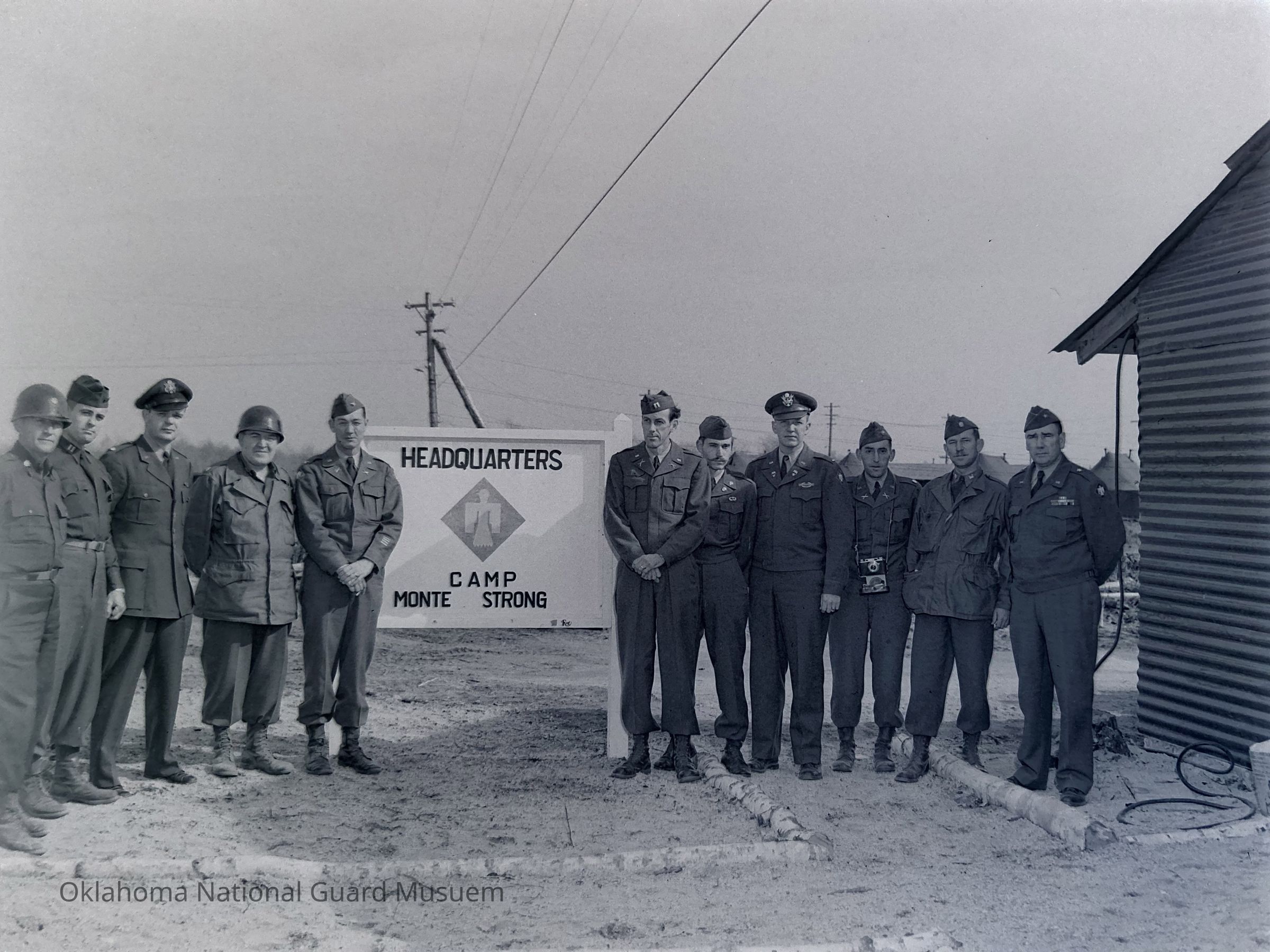 Negative of a group of soldiers in front of a sign for Camp Monte Strong on Hokkaido, Japan