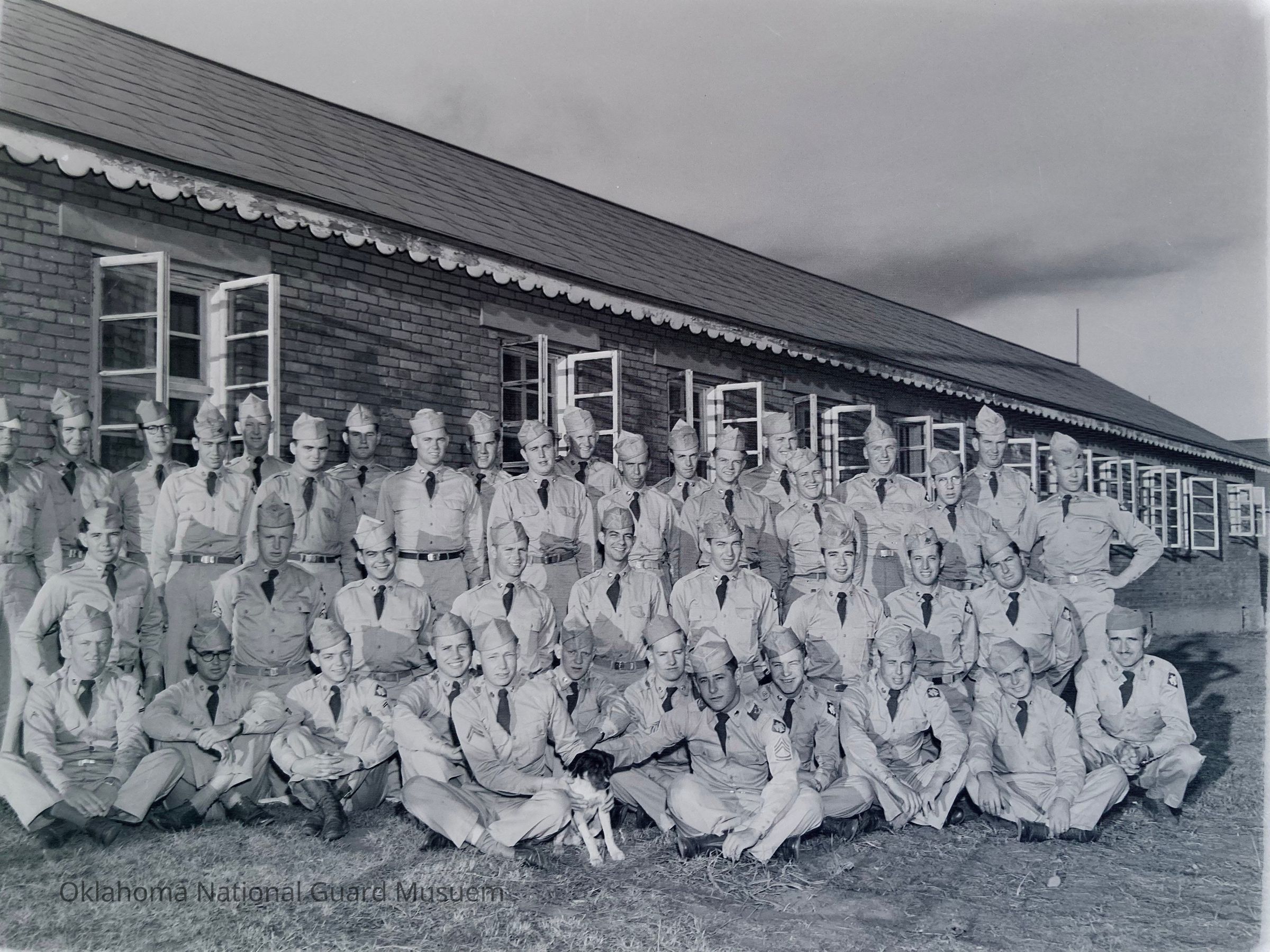 Negative of a group of soldiers in front of barracks Hokkaido, Japan