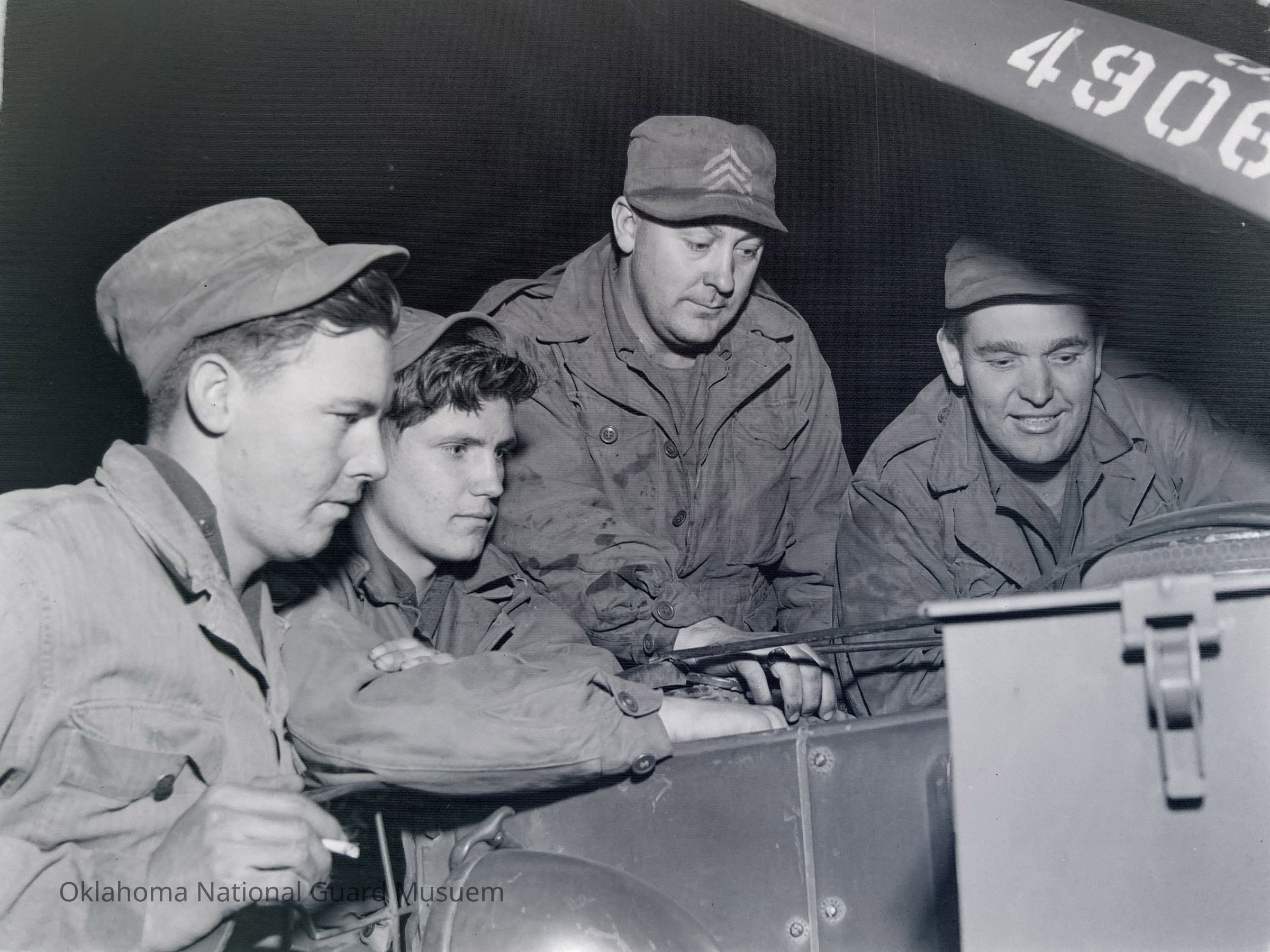 Negative of a group of soldiers looking under the hood a truck on Hokkaido, Japan
