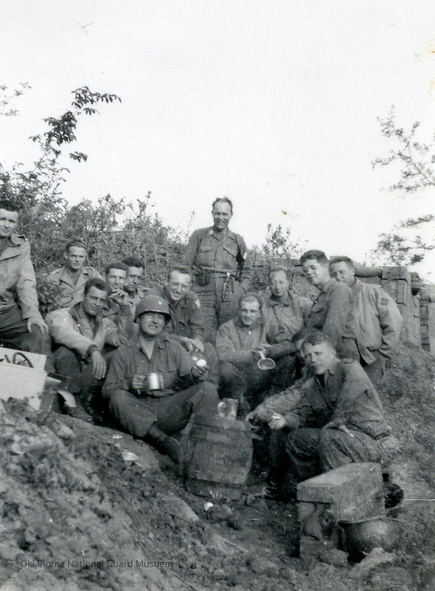 Phil Pearce, Dan Allen, Dick Turner, Ed Watson, Al Adolph, John Embry, Joel Crain, Joe Anselmo, Ben Counter, Al Brown, Monroe Little, and Skillingstead on the side of a hill with mess kits. 160th Field ArtilleryMade/Created