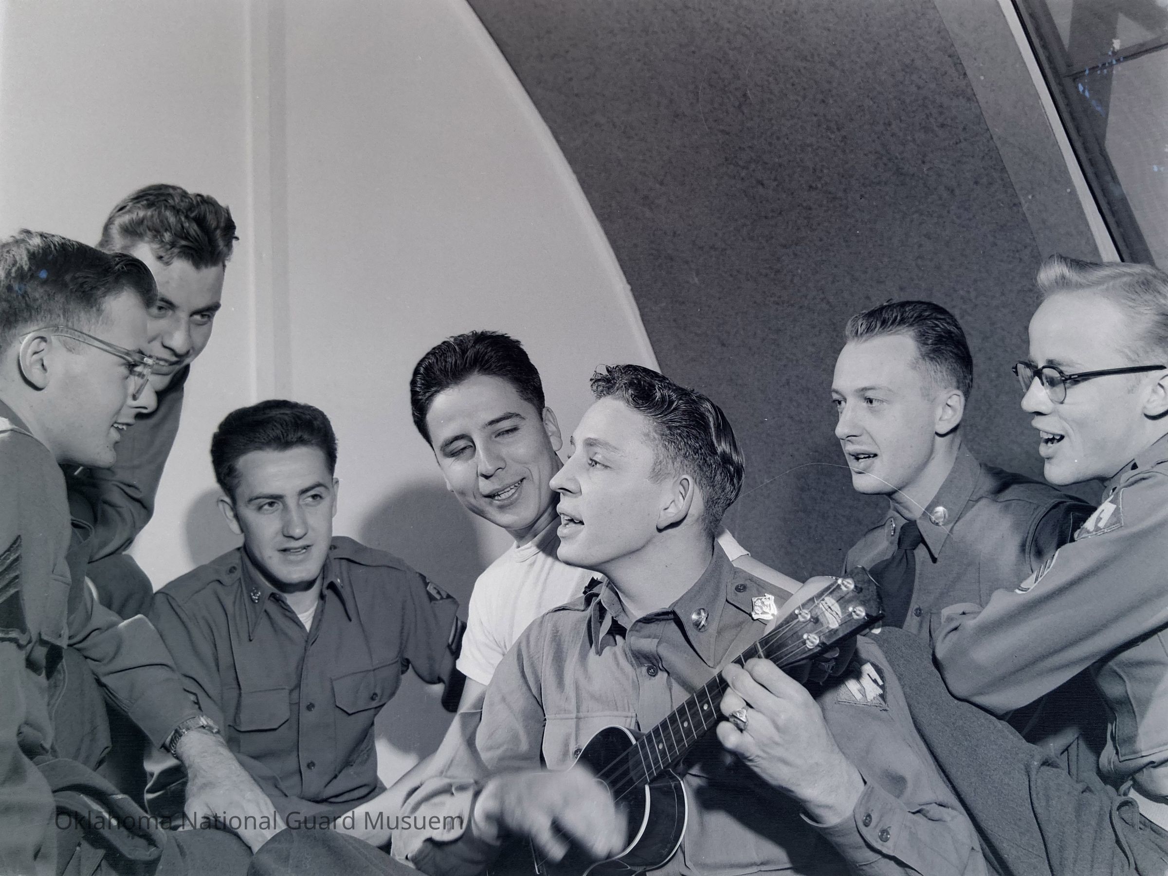 Group of soldiers singing with a ukulele player