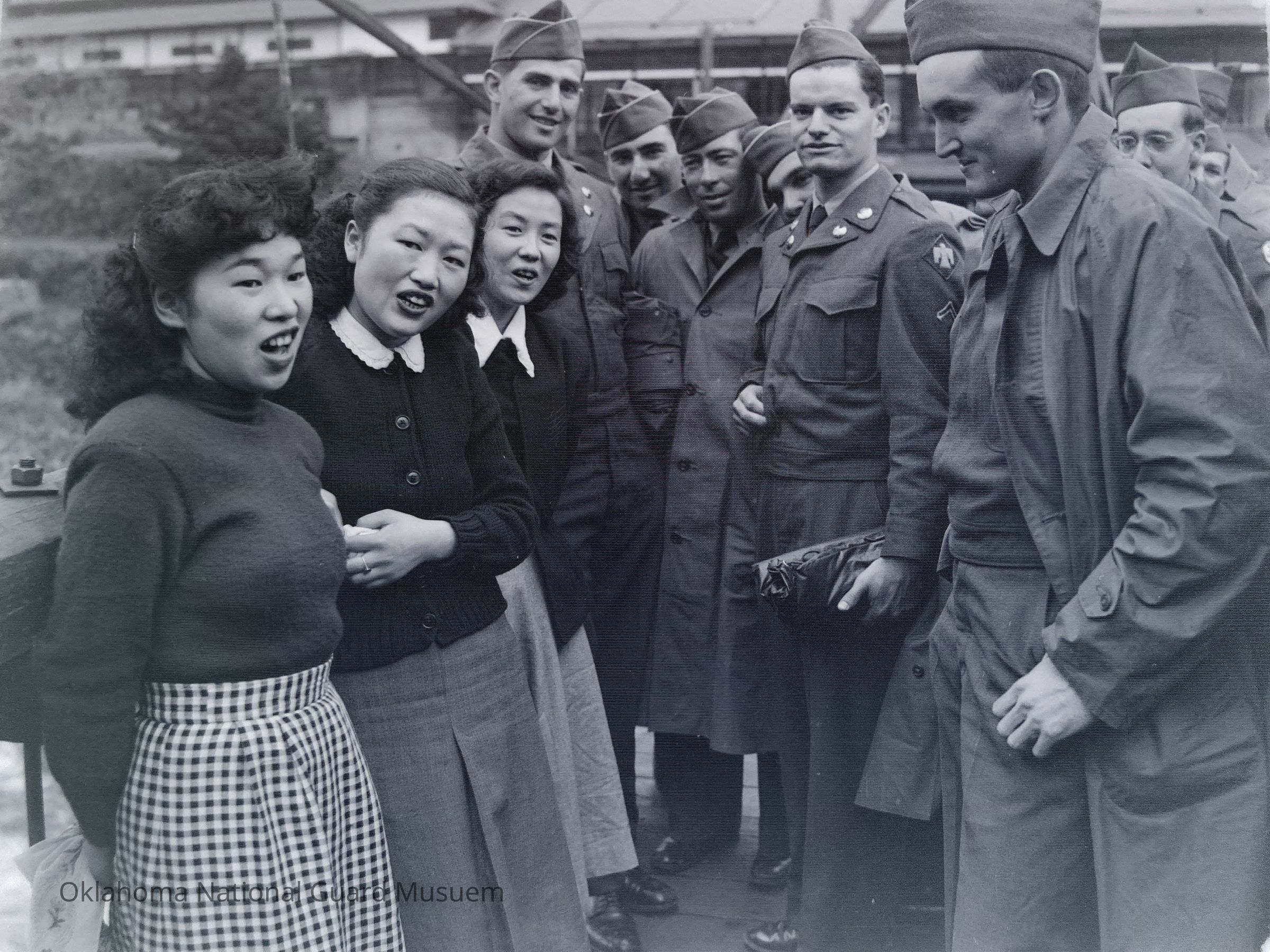 Negative of a group of soldiers talking to three Japanese girls on Hokkaido, Japan