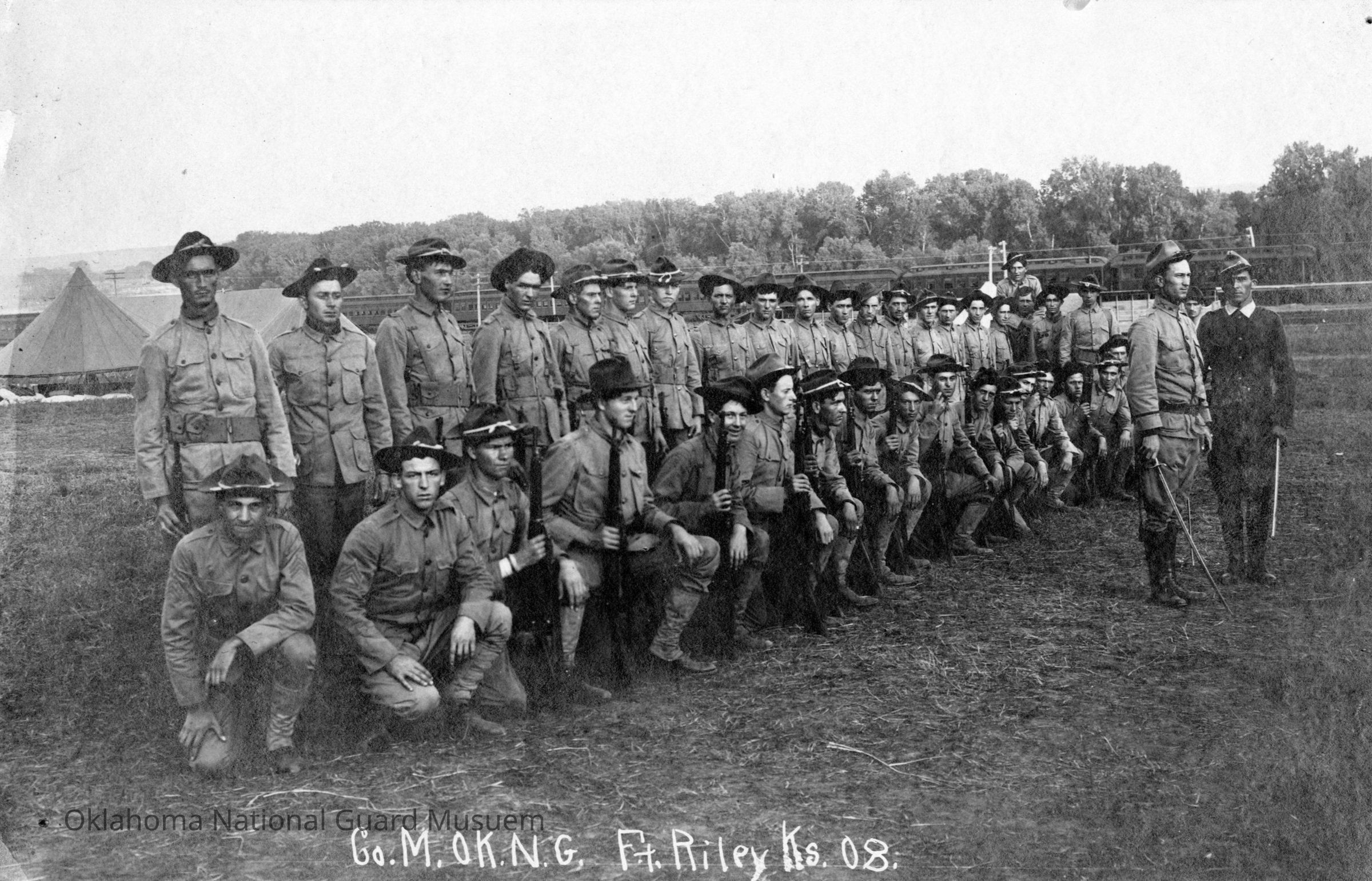 Company M First Oklahoma Infantry posing for a group photo during training