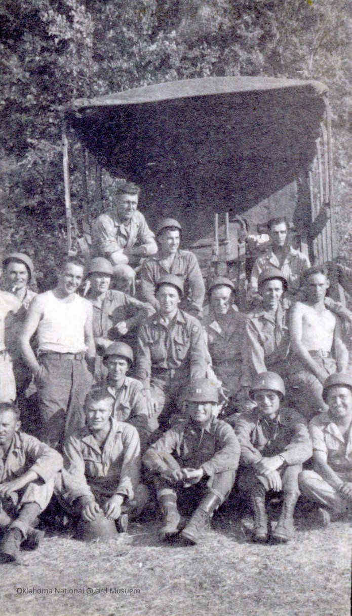 45th Division Wire Section posing for a group photo. (Back to front, Left to Right)