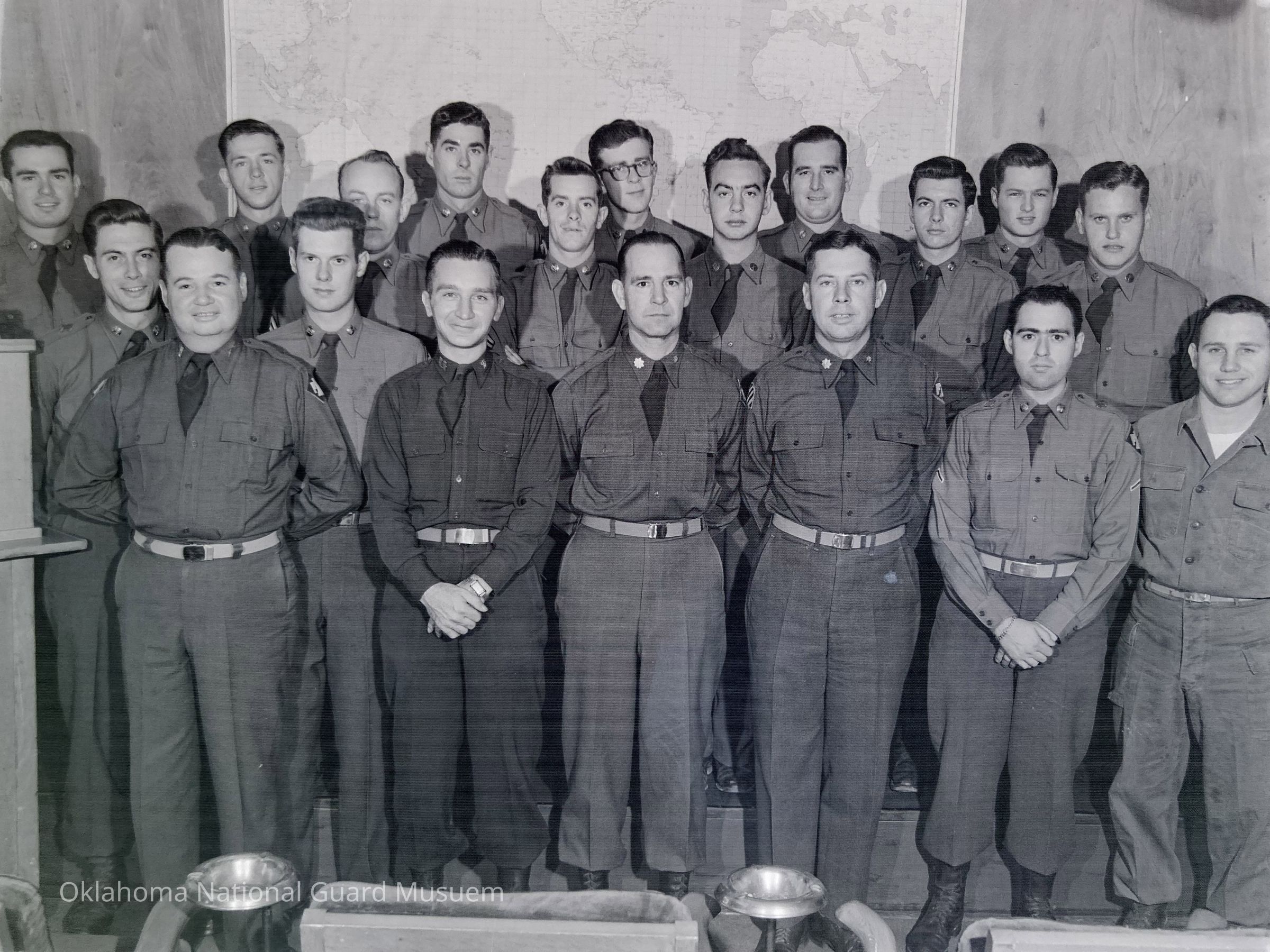 Negative of a group shot of soldiers in front of map on Hokkaido, Japan