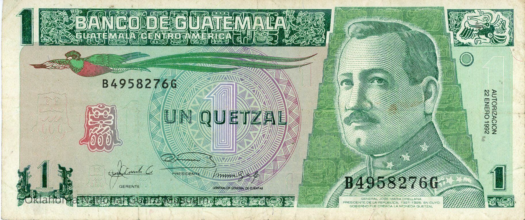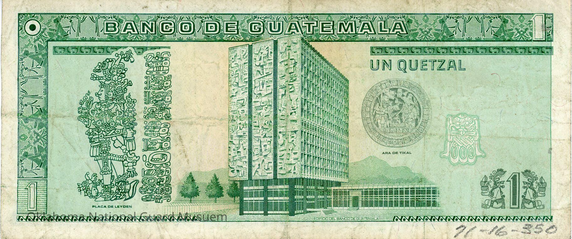 Guatemalan One Quetzal. Accession number is written on reverse in lower right corner.