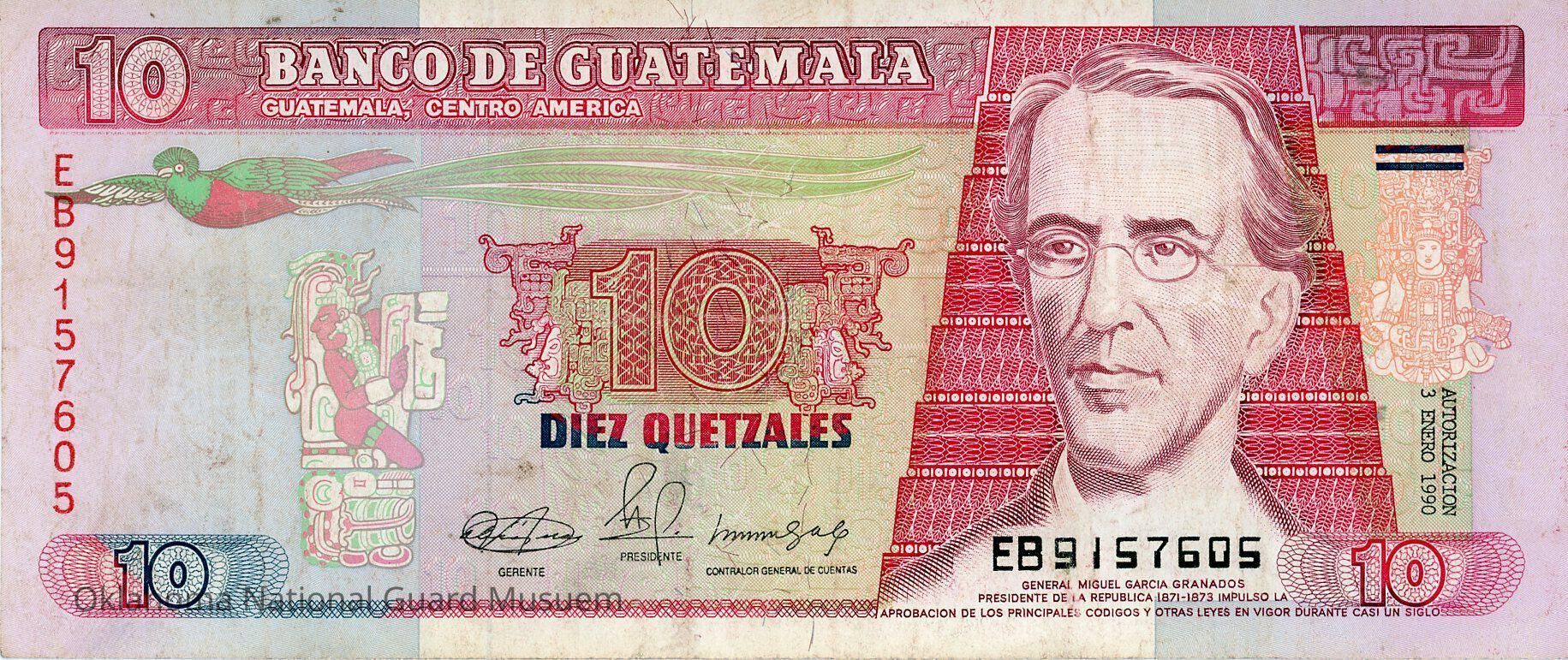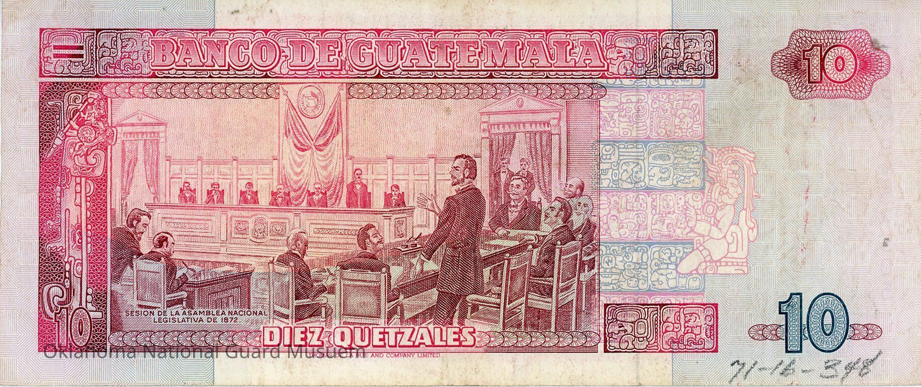 Guatemalan Ten Quetzales. Accession number written on reverse in lower right corner.