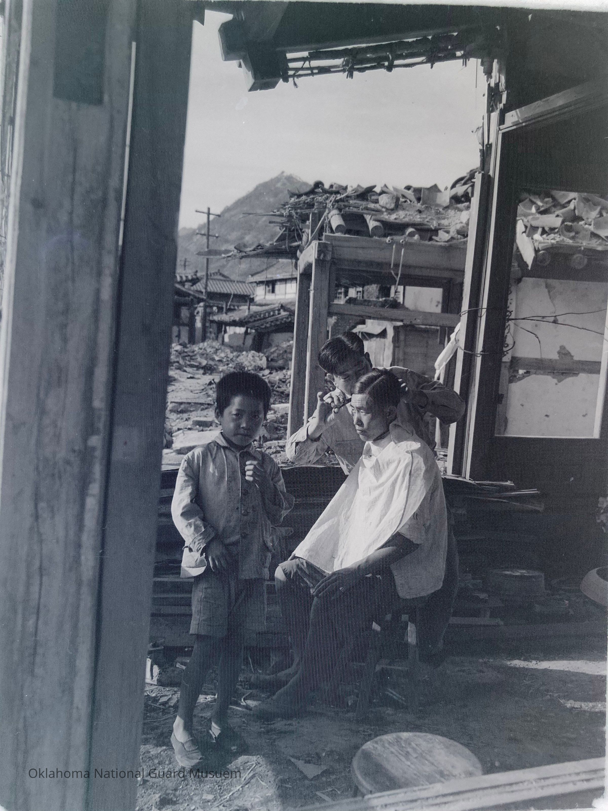 Published in the 45th Division News, Hokkaido, Japan, July 19, 1951 "A South Korean Barber set up shop in a burned-out building in Seoul. For the 45th Division News' own story on Seoul.