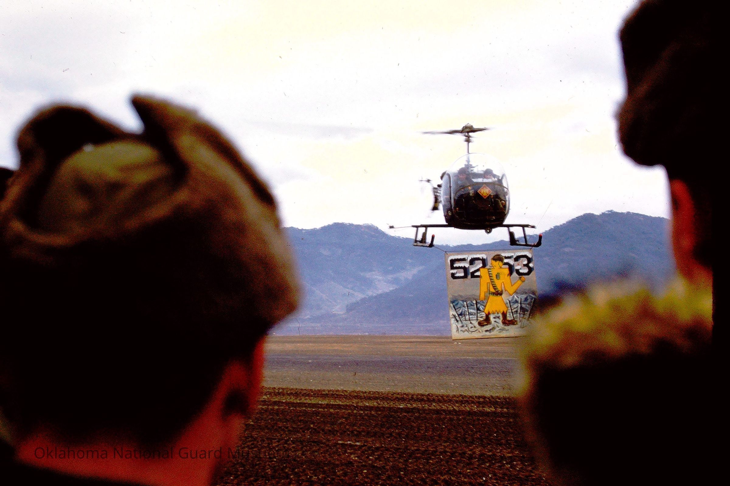 Helicopter holding sign commemorating the time the 45th Division served in Korea.