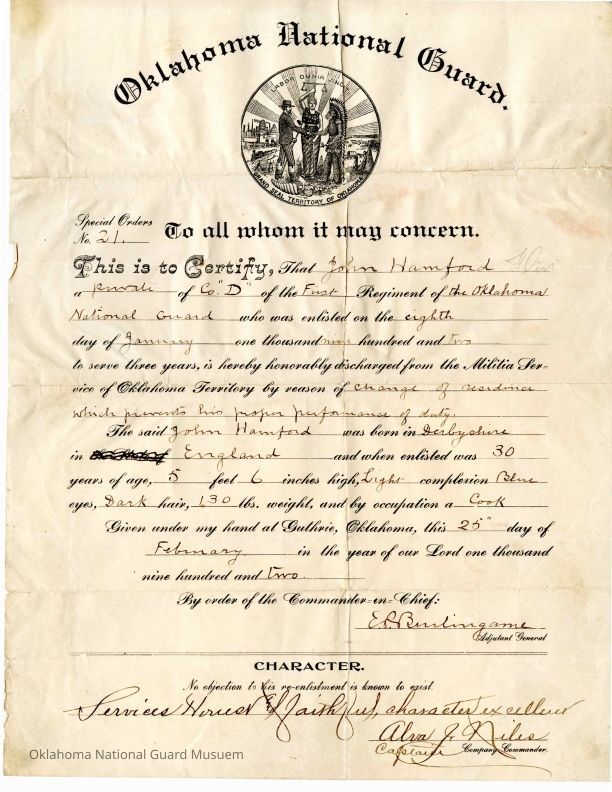 Honorable Discharge from the Oklahoma National Guard for John Hamford, Company D First Oklahoma Infantry
