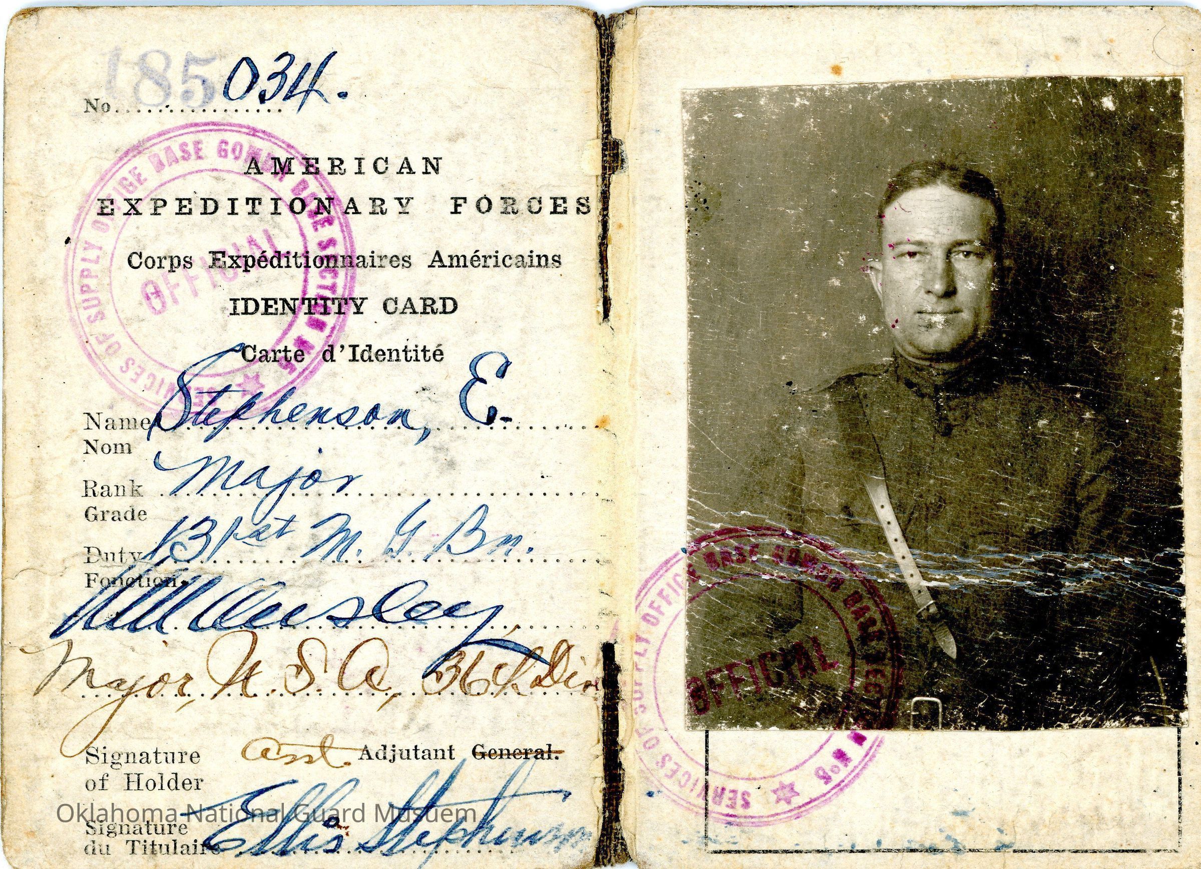 Identity Card American Expeditionary Force. Ellis Stephenson 131st Machine Gun Battalion 36th DivisionCollection