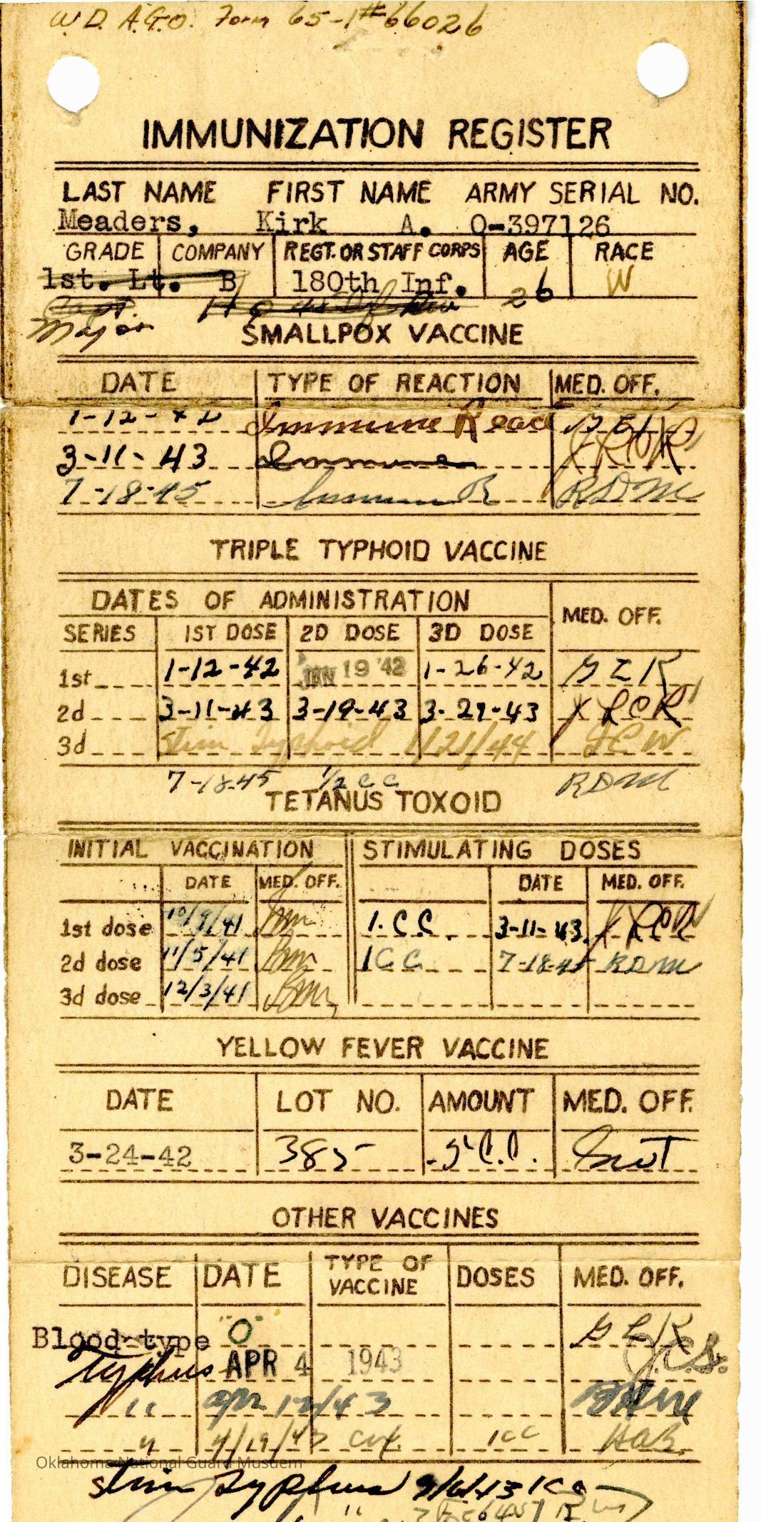 Immunization Register for Kirk Meaders 180th Infantry