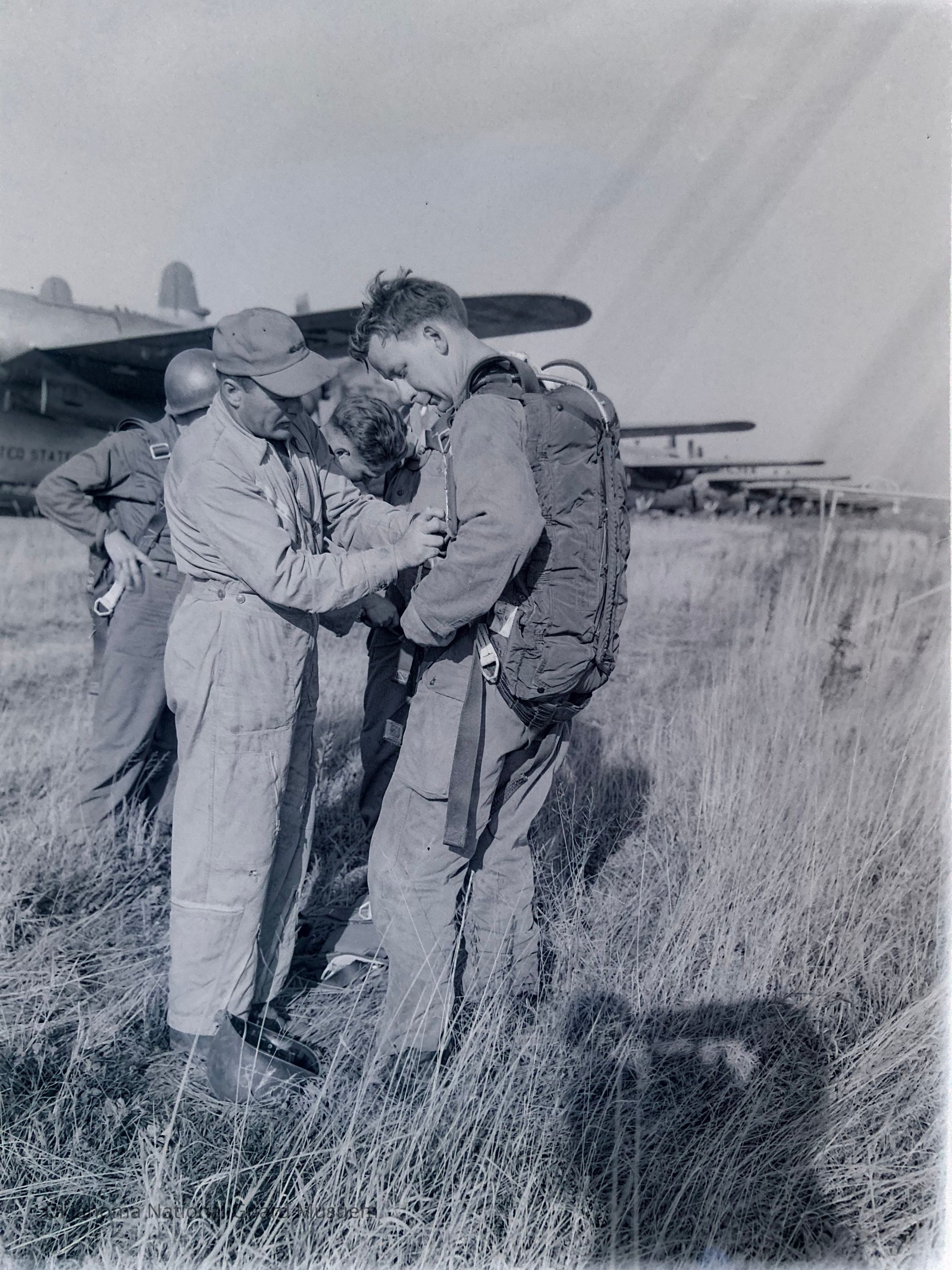Negative of an instructor helping a paratrooper with his gear. 45th Special Forces