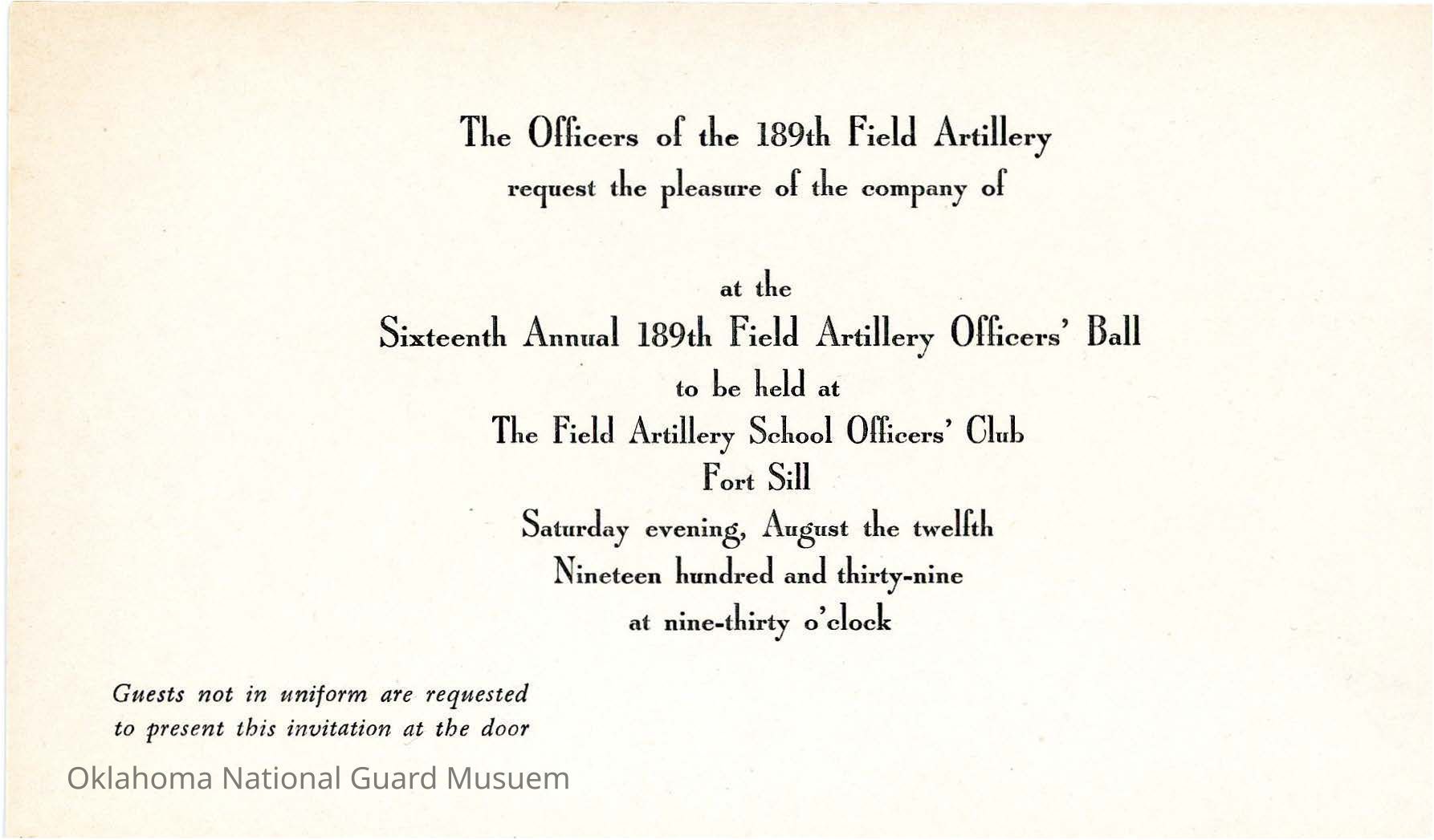 Invitation to Field Artillery Officers' Ball 189th Field Artillery