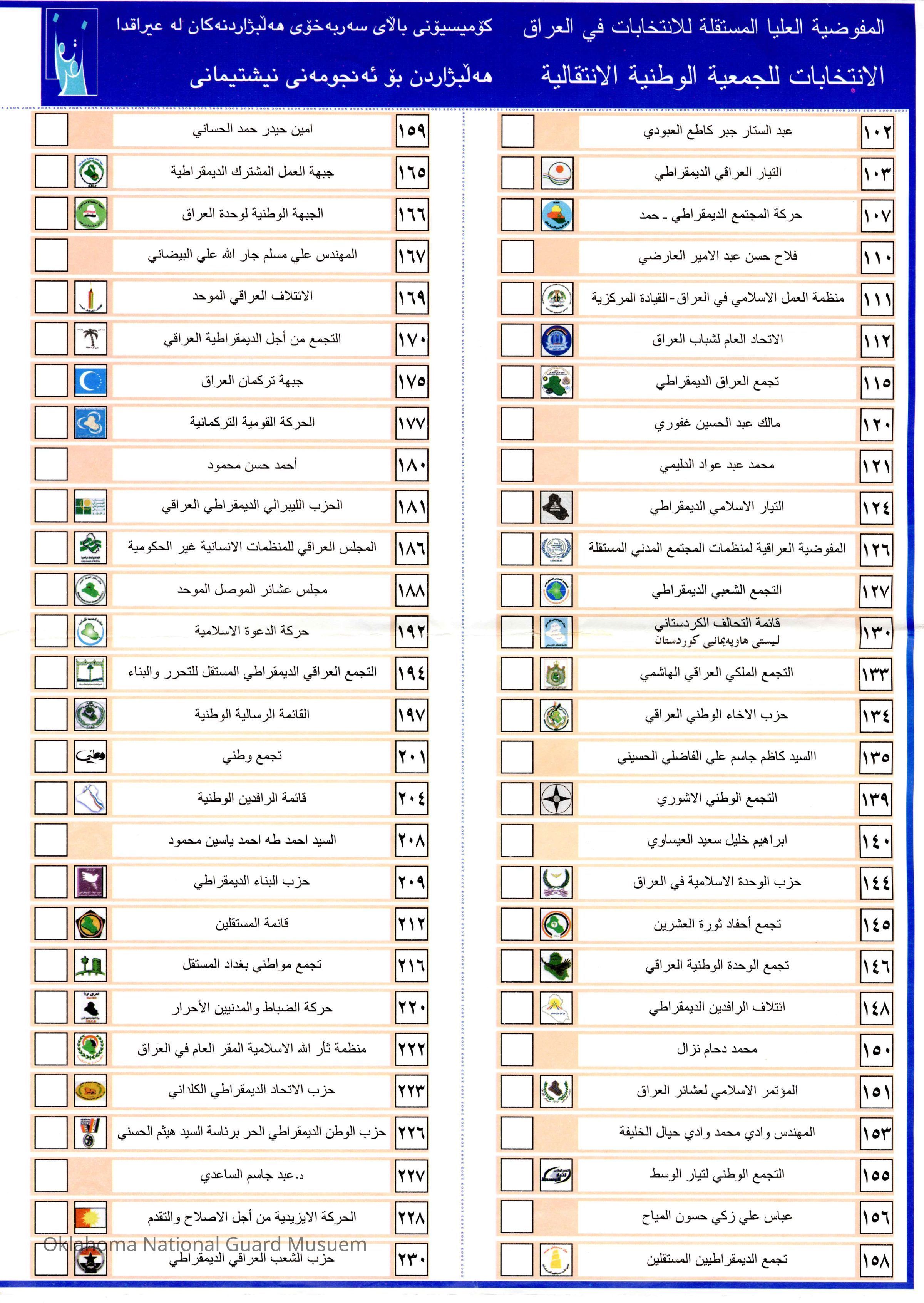 Iraqi ballot from first election in 2005. Picked up by the 120th Engineers who helped provide security