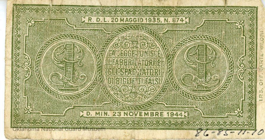 Italian One Lira-1944. Accession number written on reverse in bottom right corner.