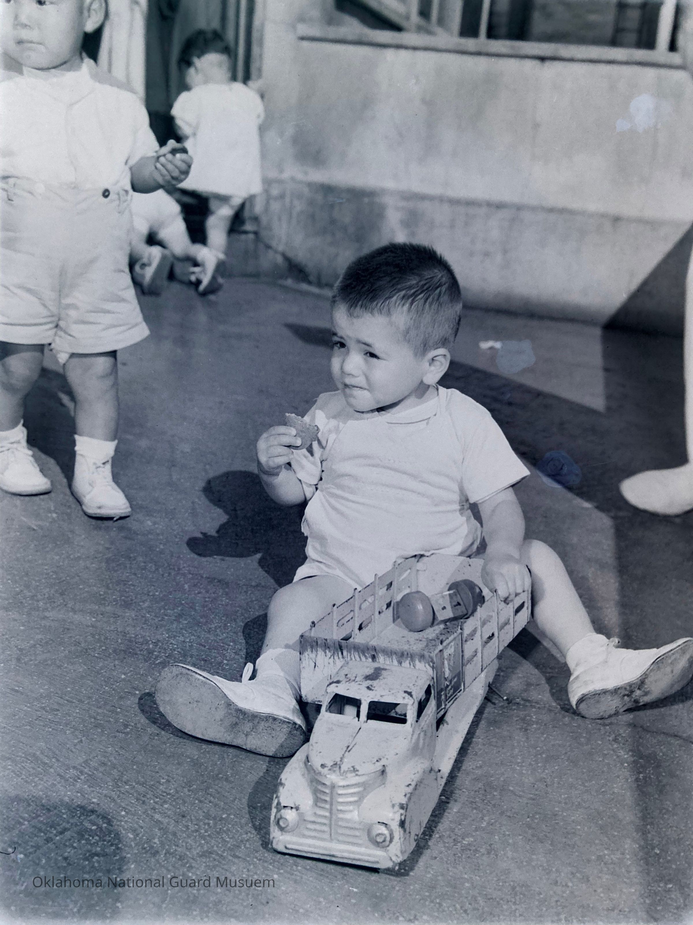 Negative of a Japanese boy playing with a toy truck on Hokkaido, Japan