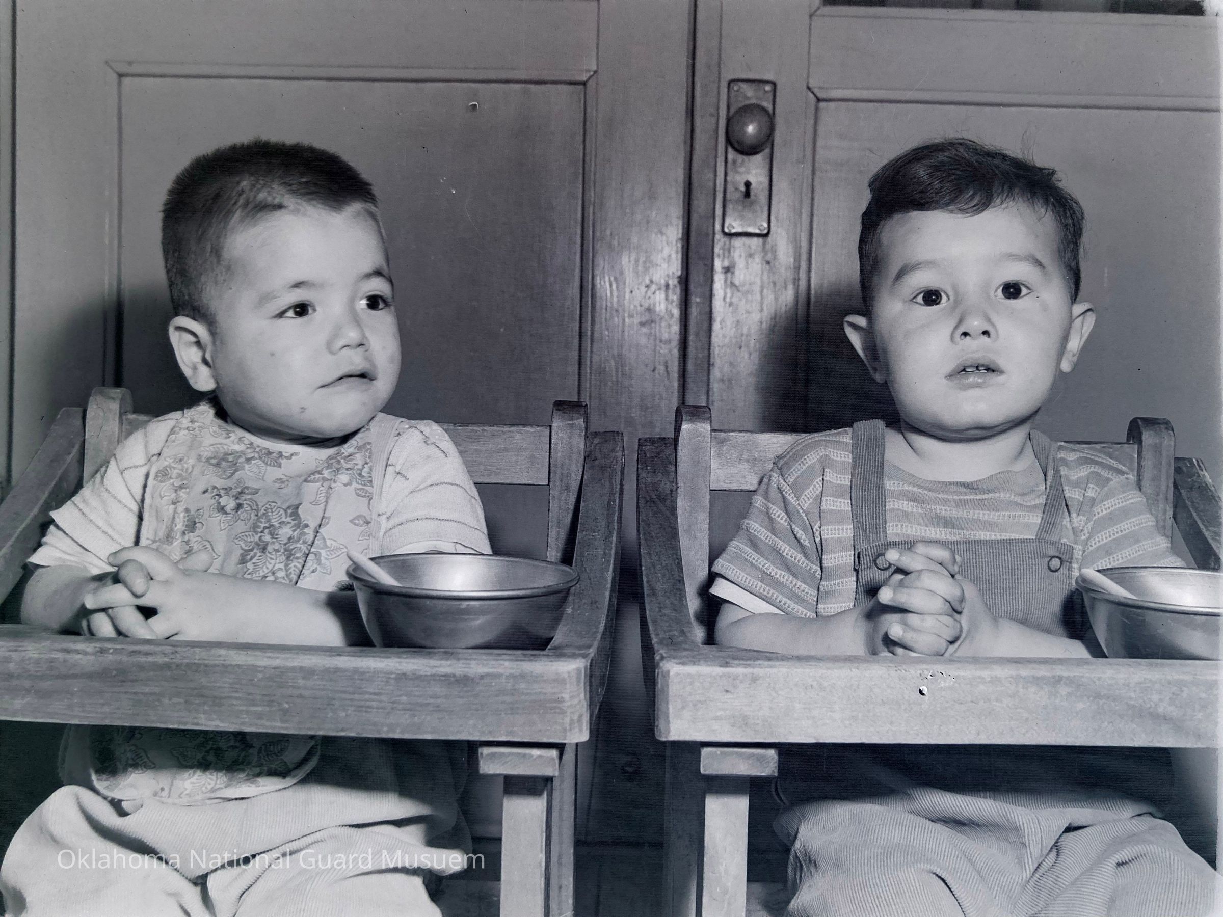 Negative of Japanese children in highchairs on Hokkaido, Japan