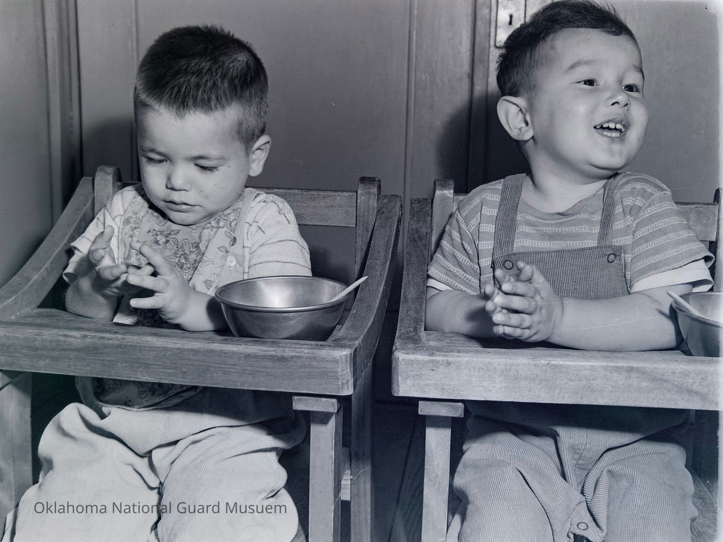 Negative of Japanese children in highchairs on Hokkaido, Japan