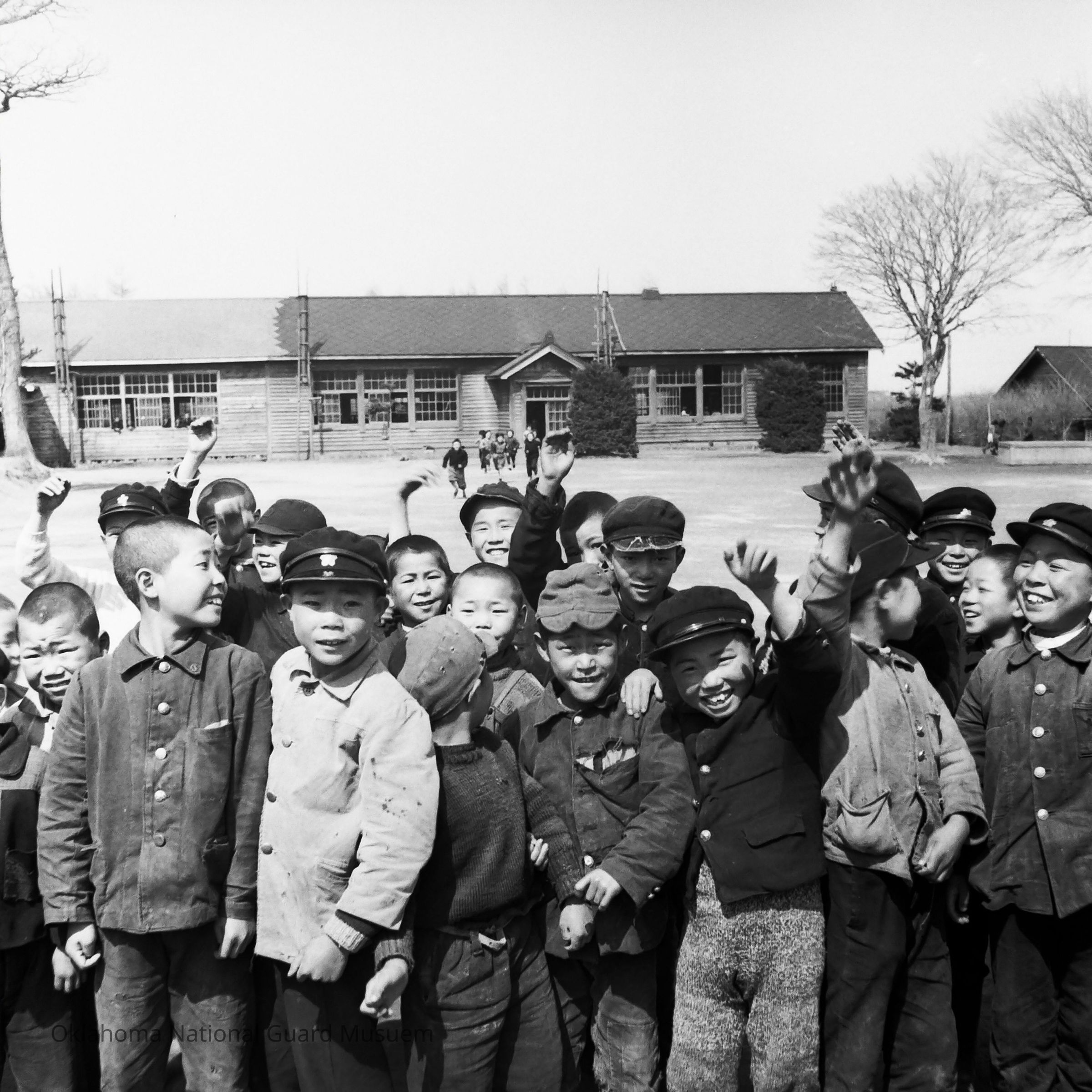 Negative of Japanese children standing in front of school