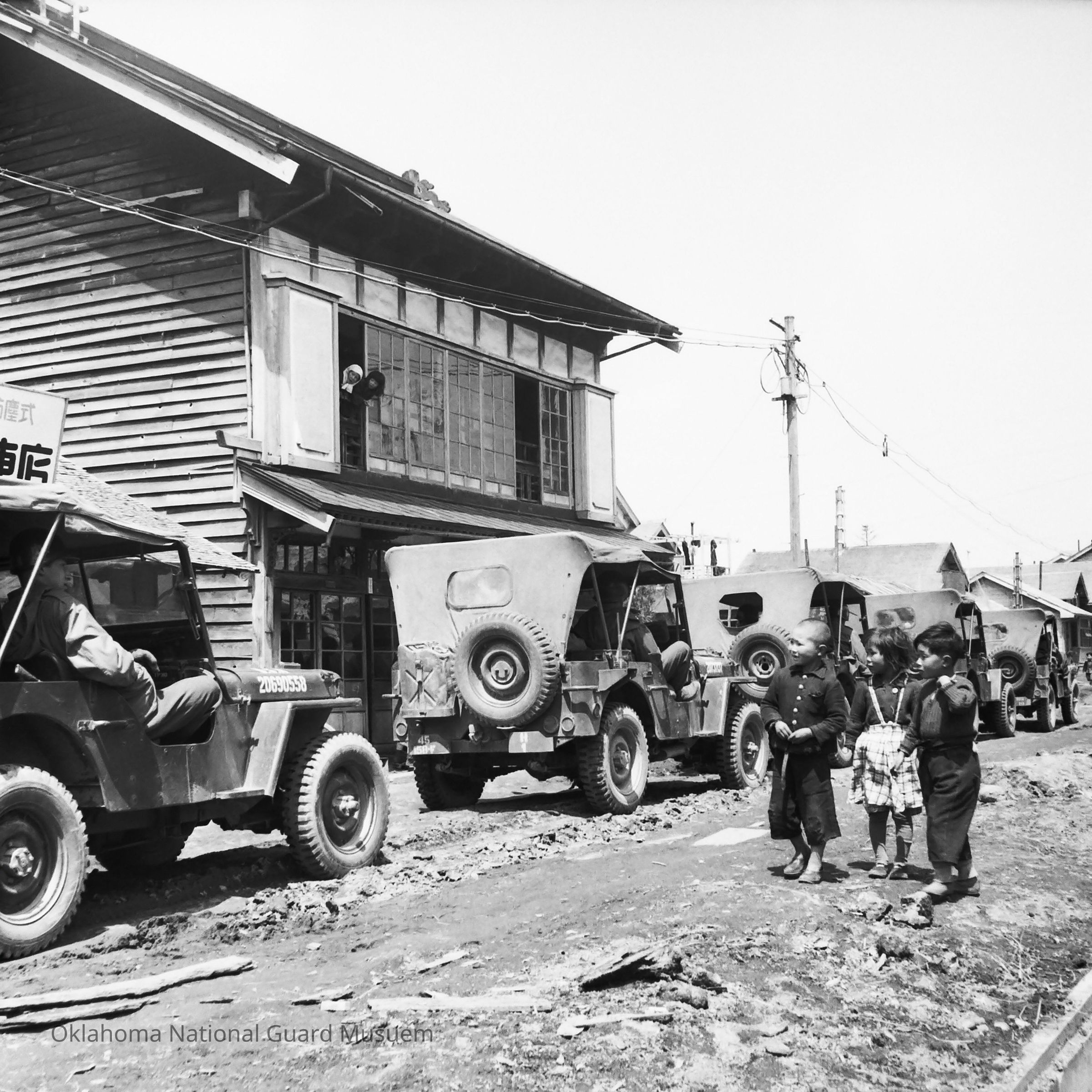 Japanese children watching jeep convoy