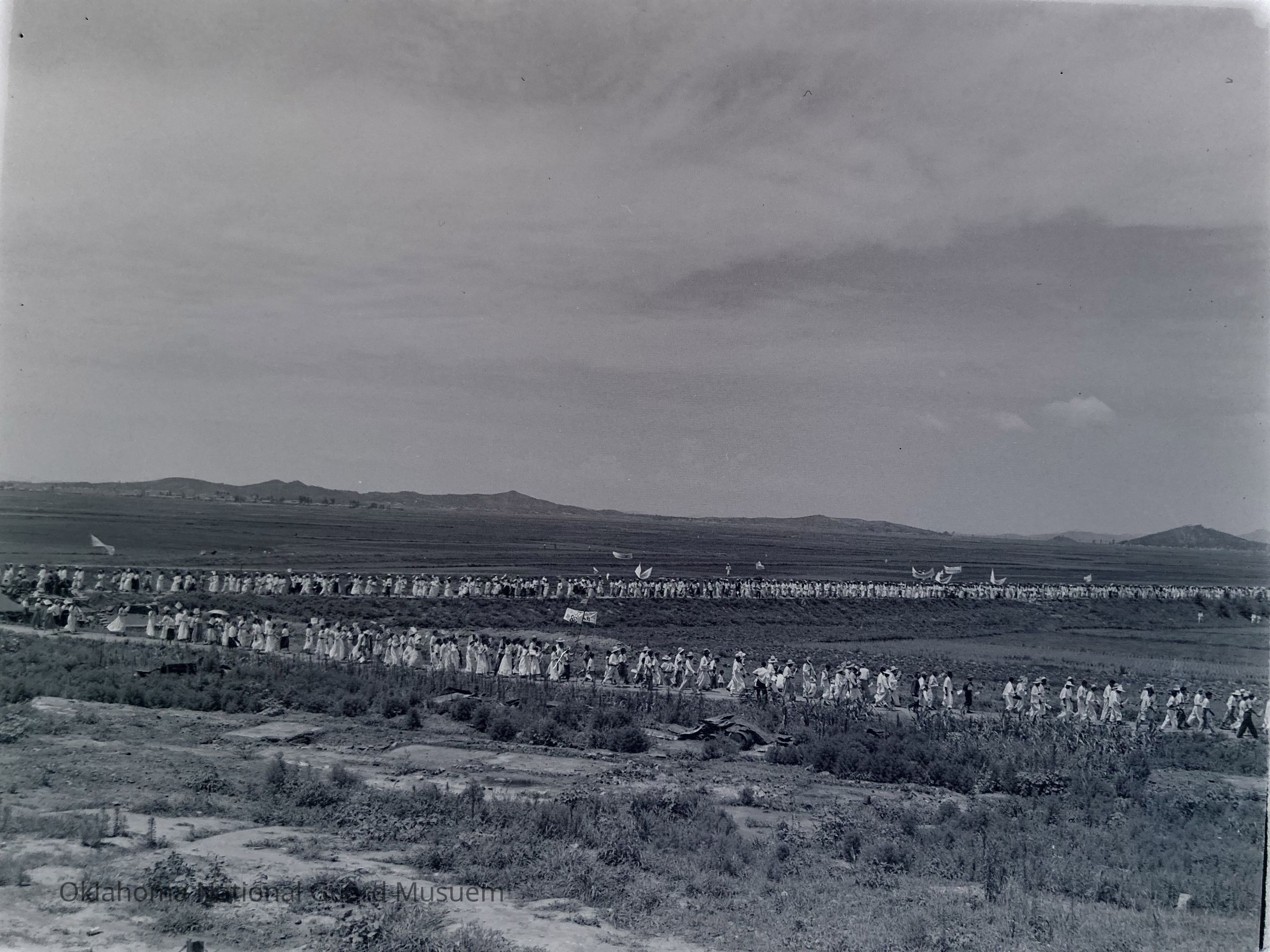 Negative of Japanese civilians parading with banners on Hokkaido, Japan