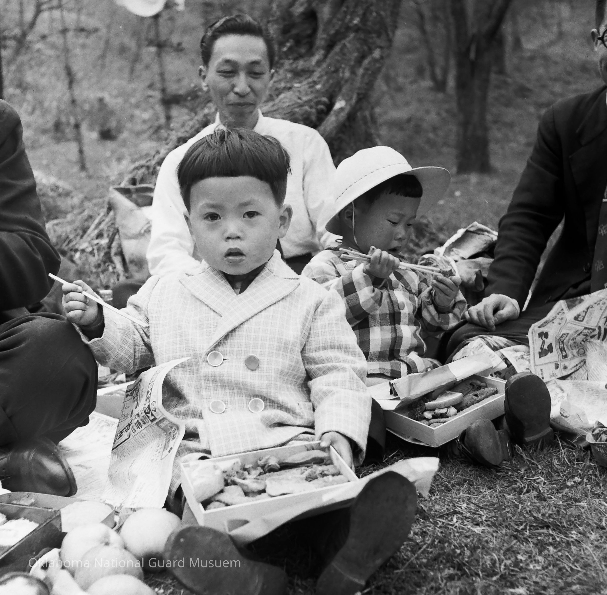 Negative of a Japanese family having a picnic