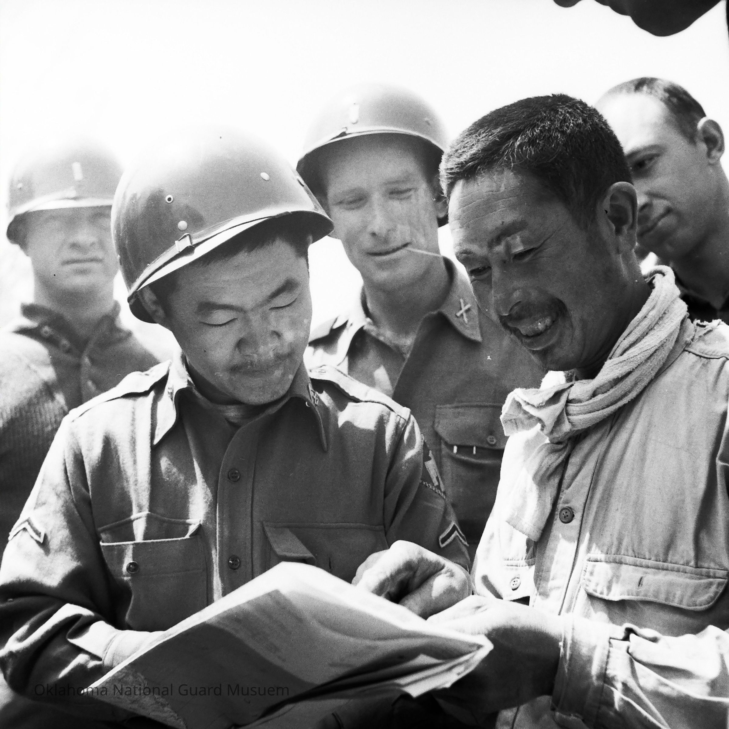 Negative of a Japanese man laughing with soldiers. One of the soldiers appears to be a Japanese interpreter