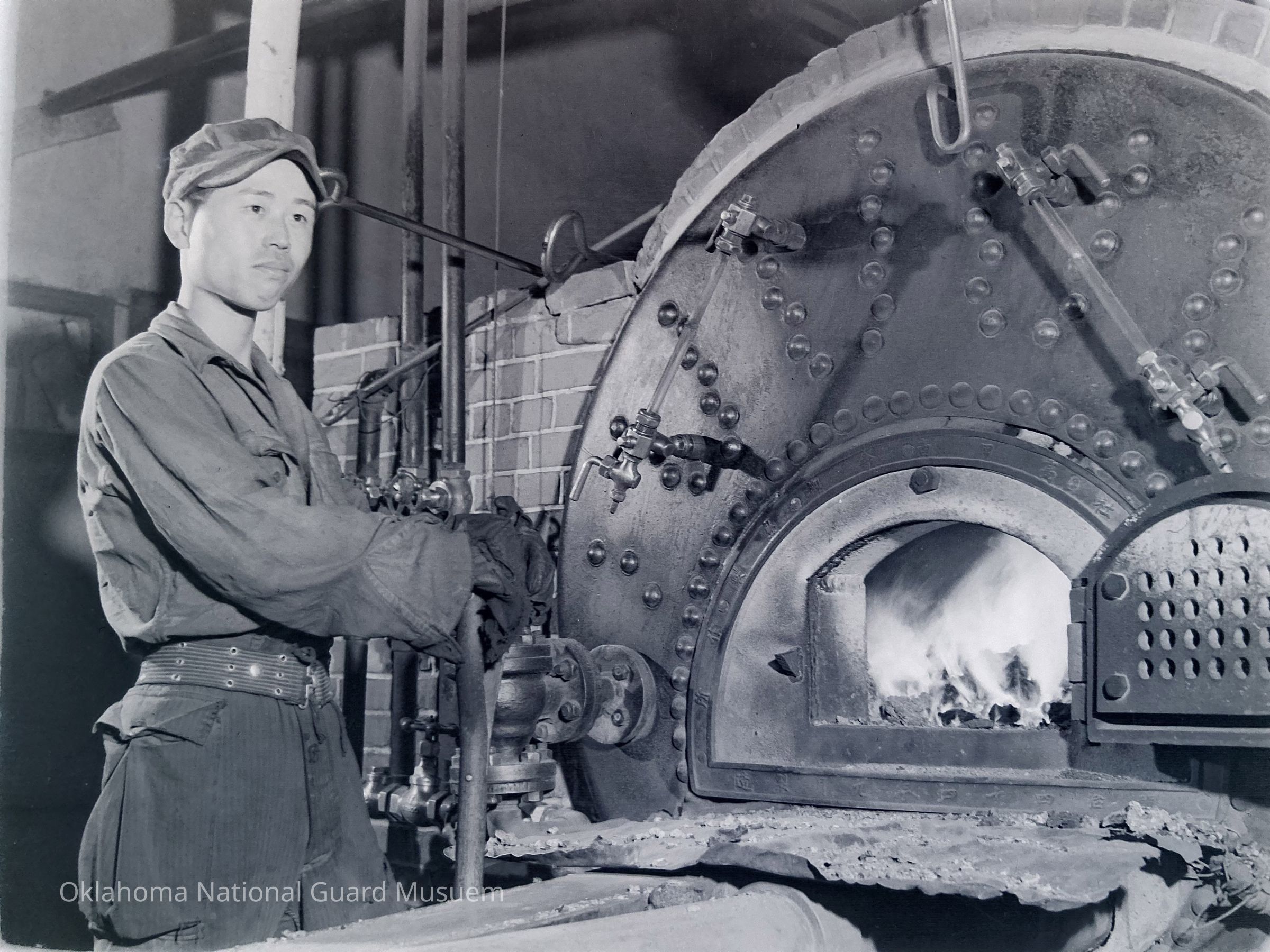 Negative of a Japanese man stoking a boiler on Hokkaido, Japan