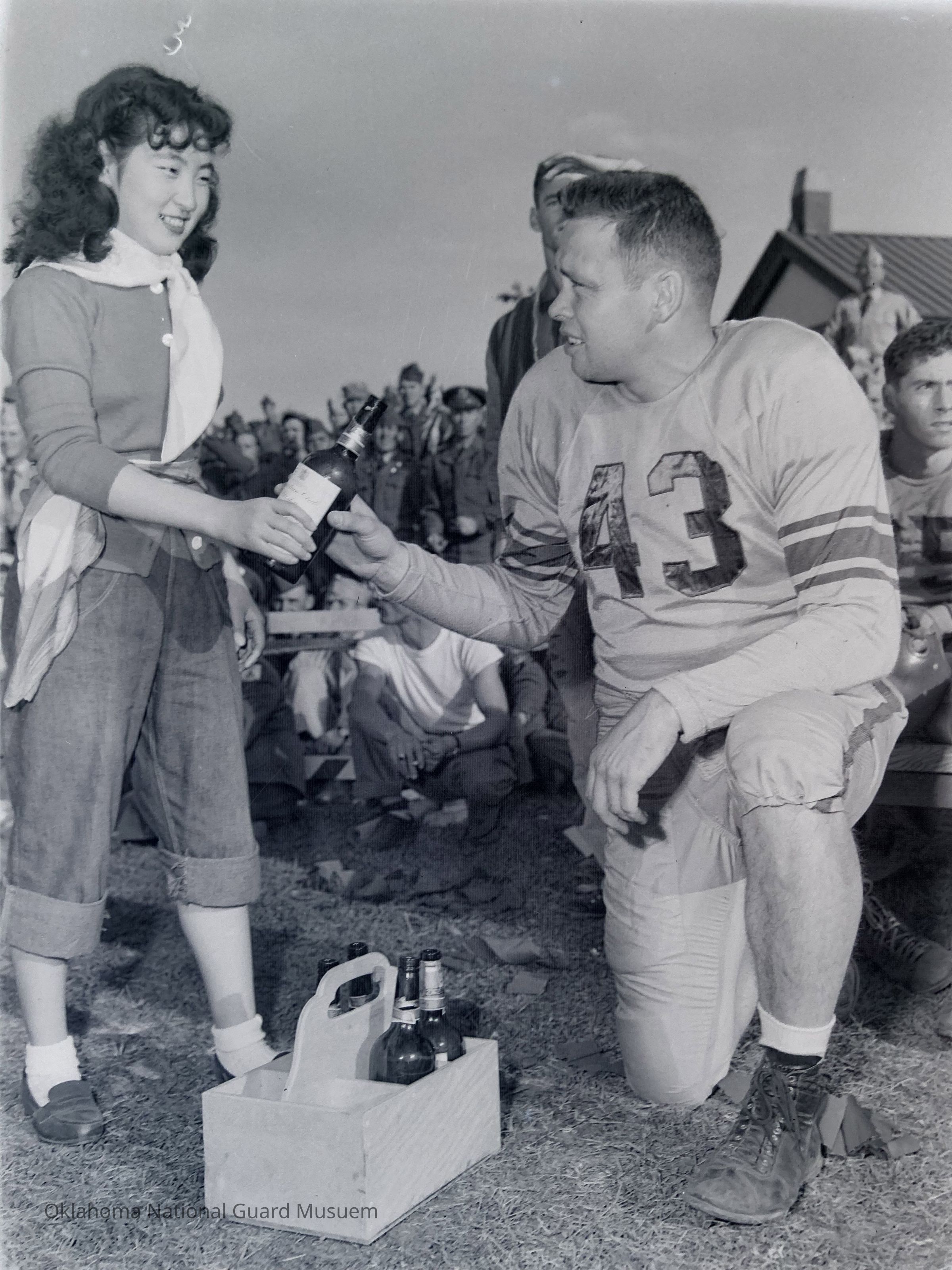 Published in the 45th Division News, Hokkaido, Japan, October 4, 1951 "The time outs were nice too. Sally Tomarikawa hands GHQ's Dick Hefti a whiskey bottle filled with water."Made/Created