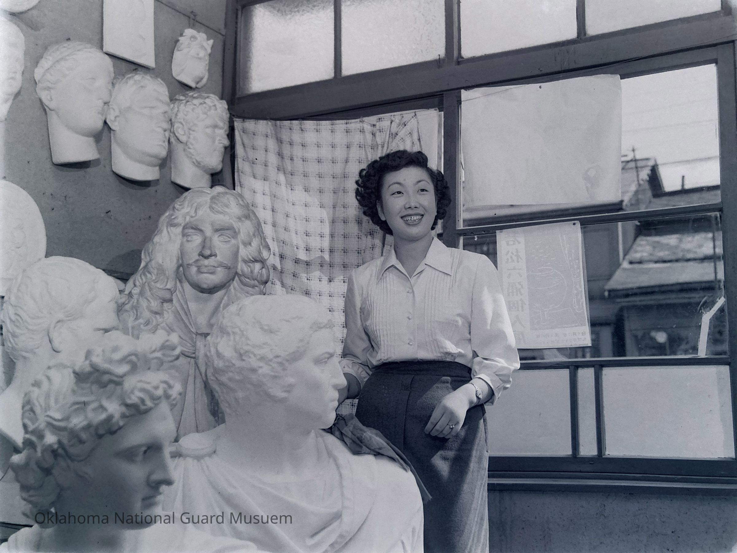 Negative of a Japanese woman in a studio filled with plaster busts on Hokkaido, Japan