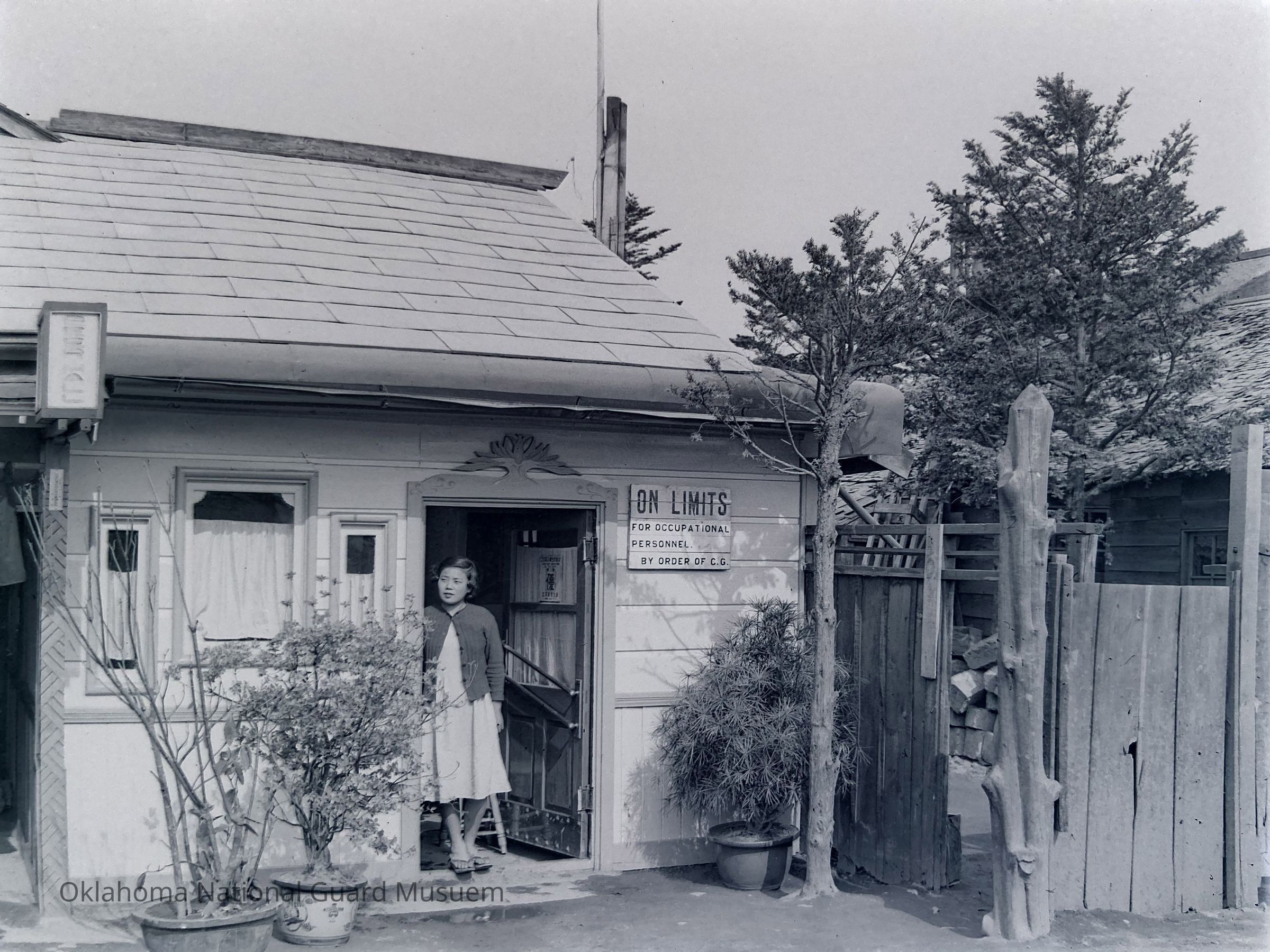 Negative of a Japanese woman standing in doorway of a small business on Hokkaido, Japan